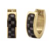 Ein Paar Ohrringe von Traveller mit stilvollem, zeitlosem Design. Die vergoldeten Creolen aus Edelstahl sind vergoldet und mit Karbondetails in Form eines Rautenmusters versehen. Die Ohrringe haben einen Durchmesser von 1,4 Zentimetern und wiegen jeweils etwa 1,5 Gramm.