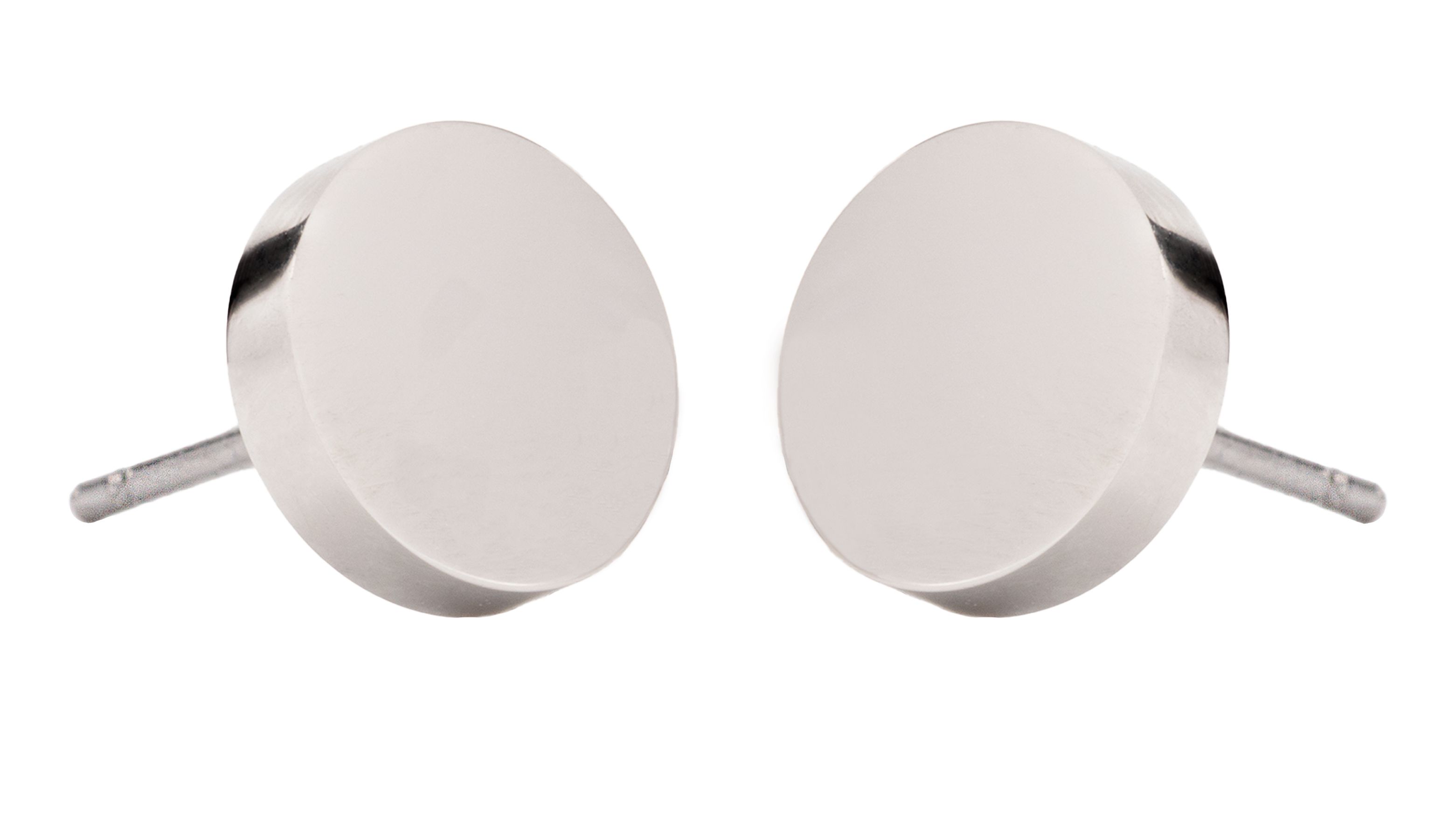 Ein Paar Ohrringe von Traveller mit stilvollem, zeitlosem Design. Die Ohrstecker aus glänzendem, silberfarbenem Edelstahl haben die Form eines Kreises. Die Ohrringe haben einen Durchmesser von 0,8 Zentimetern und wiegen jeweils etwa 1 Gramm.