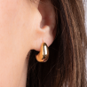 Diese Ohrringe von Traveller sind stilvoll und zeitlos dank ihres schlichten Designs. Von der Seite sind sie strahlende Halbmonde und von vorne glänzende Tropfen. Die Ohrringe sind 17 x 8 Millimeter groß, wiegen jeweils 3 Gramm und sind vollständig vergoldet.