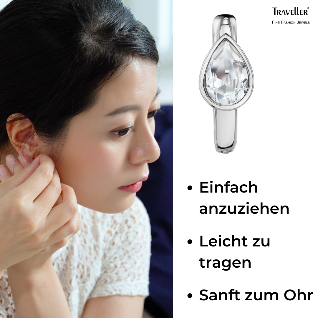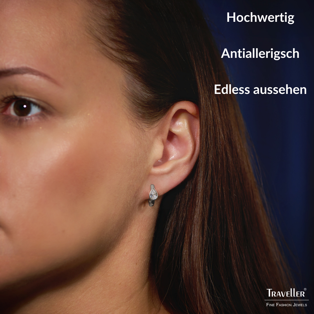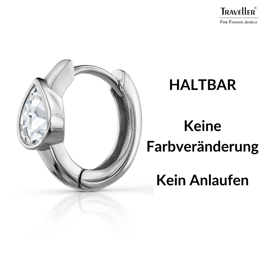 Diese besonderen Creolen von Traveller haben ein zeitloses Design mit einem modernen Look. Die silberfarbenen Edelstahlohrringe sind in der Mitte mit einem funkelnden, tropfenförmigen Zirkonia besetzt. Die Ohrringe haben einen Durchmesser von 15 Millimetern und wiegen jeweils 1 Gramm.
