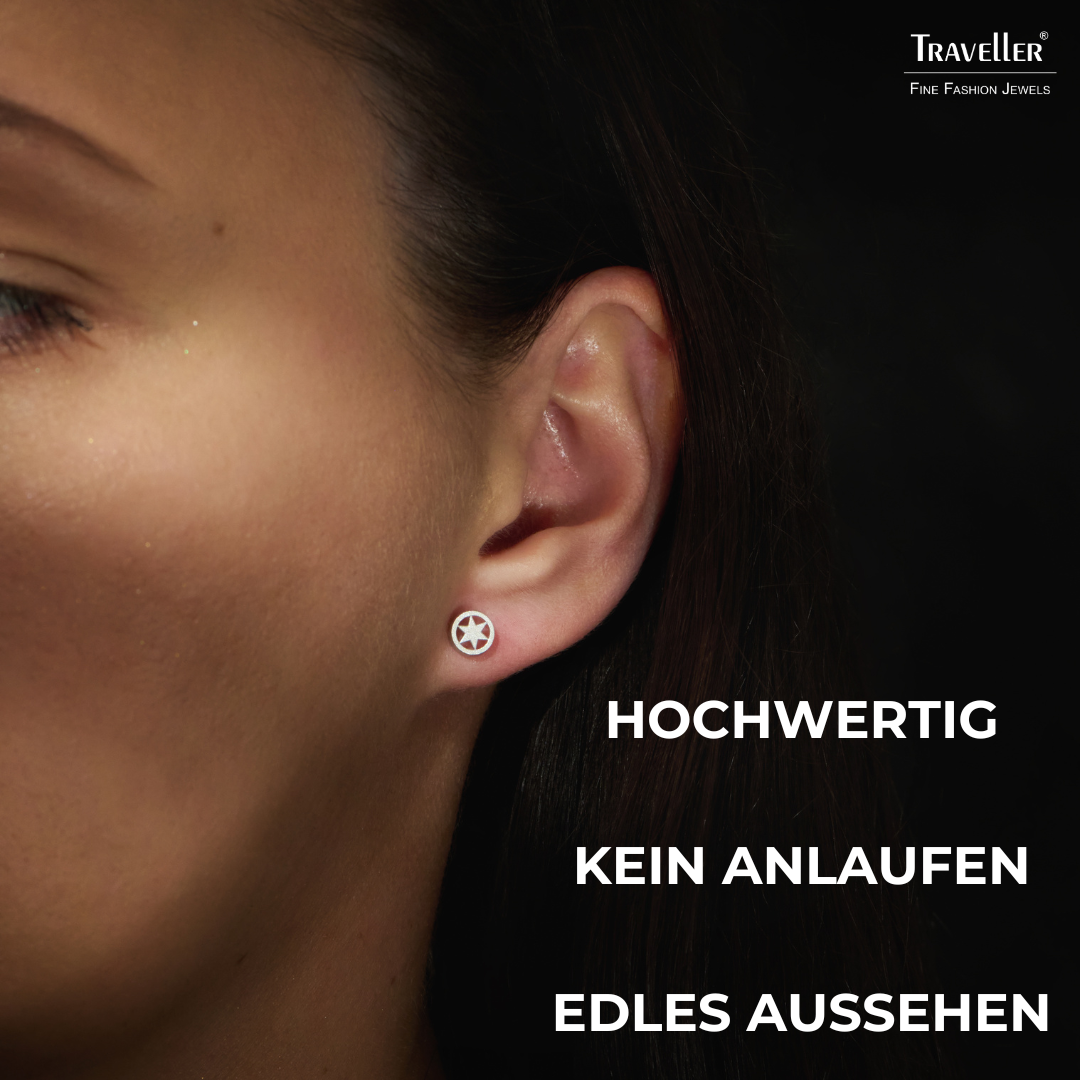 Die mattierten, runden Ohrringe bestehen aus einem Kreis, in dem sich ein Stern befindet. Die Ohrringe sind 6 Millimeter groß und wiegen jeweils nur 0,5 Gramm. Die Ohrringe sind aus Silber gefertigt, was sie nicht nur langlebig, sondern auch antiallergisch und damit für fast jeden tragbar macht.