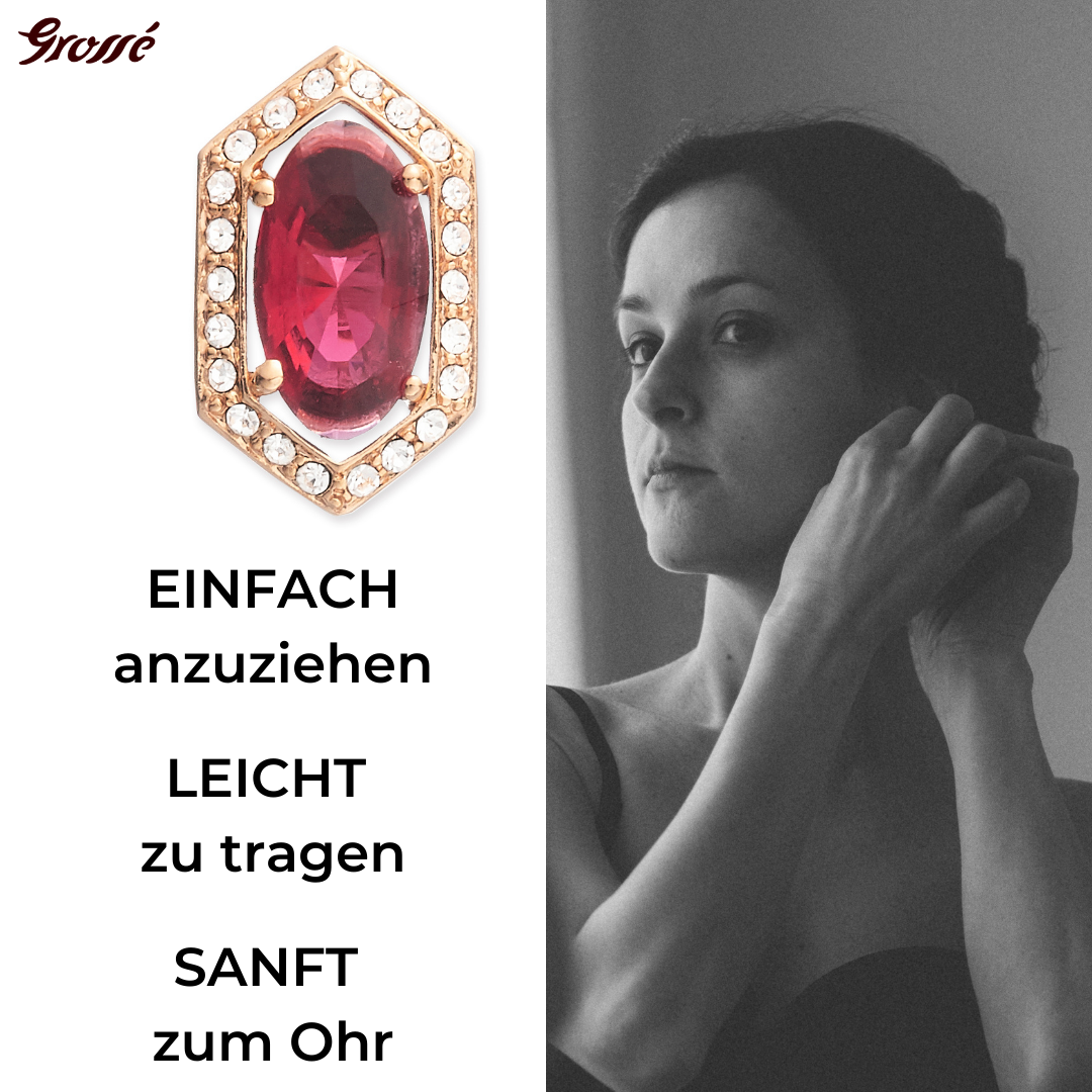 Die elegante Linie Jelly Beans von Grossé ist eine glänzende Schmucklinie, deren Herzstück ein großer Kristall in Form einer Jelly Bean ist. Diese Ohrringe haben ein elegantes, klassisches Design mit einem roten Kristallherz, das von kleinen funkelnden Kristallen umgeben ist. Die Kristalle werden von Preciosa Crystals hergestellt. Die komplett 22-karätig vergoldeten Ohrringe sind 15 x 9 Millimeter groß und wiegen jeweils nur 1,5 Gramm.