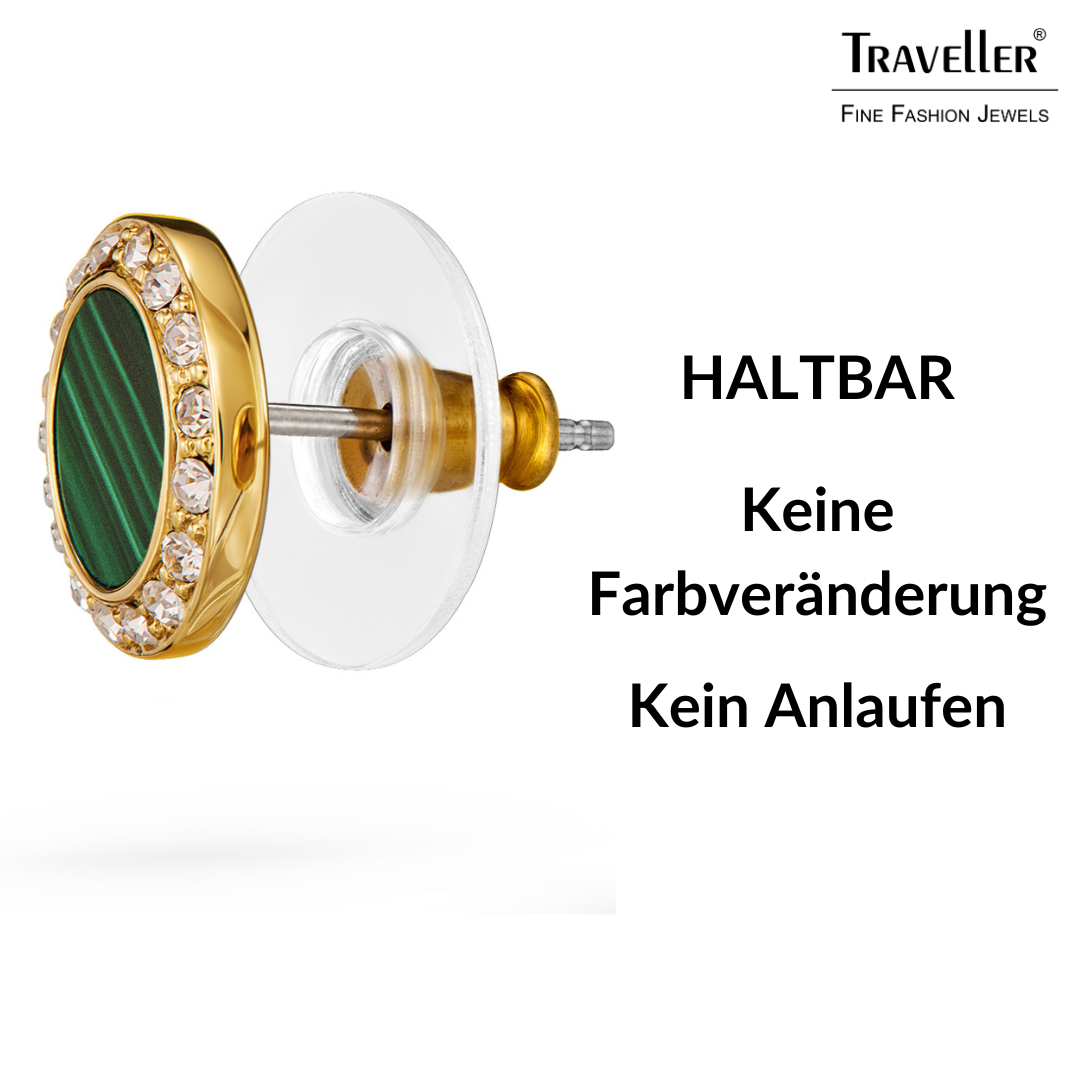 Traveller Ohrstecker - 22kt Vergoldet - Echter Malachit - Grün - Kristalle - Ø 9 mm - Einzigartig - 112507