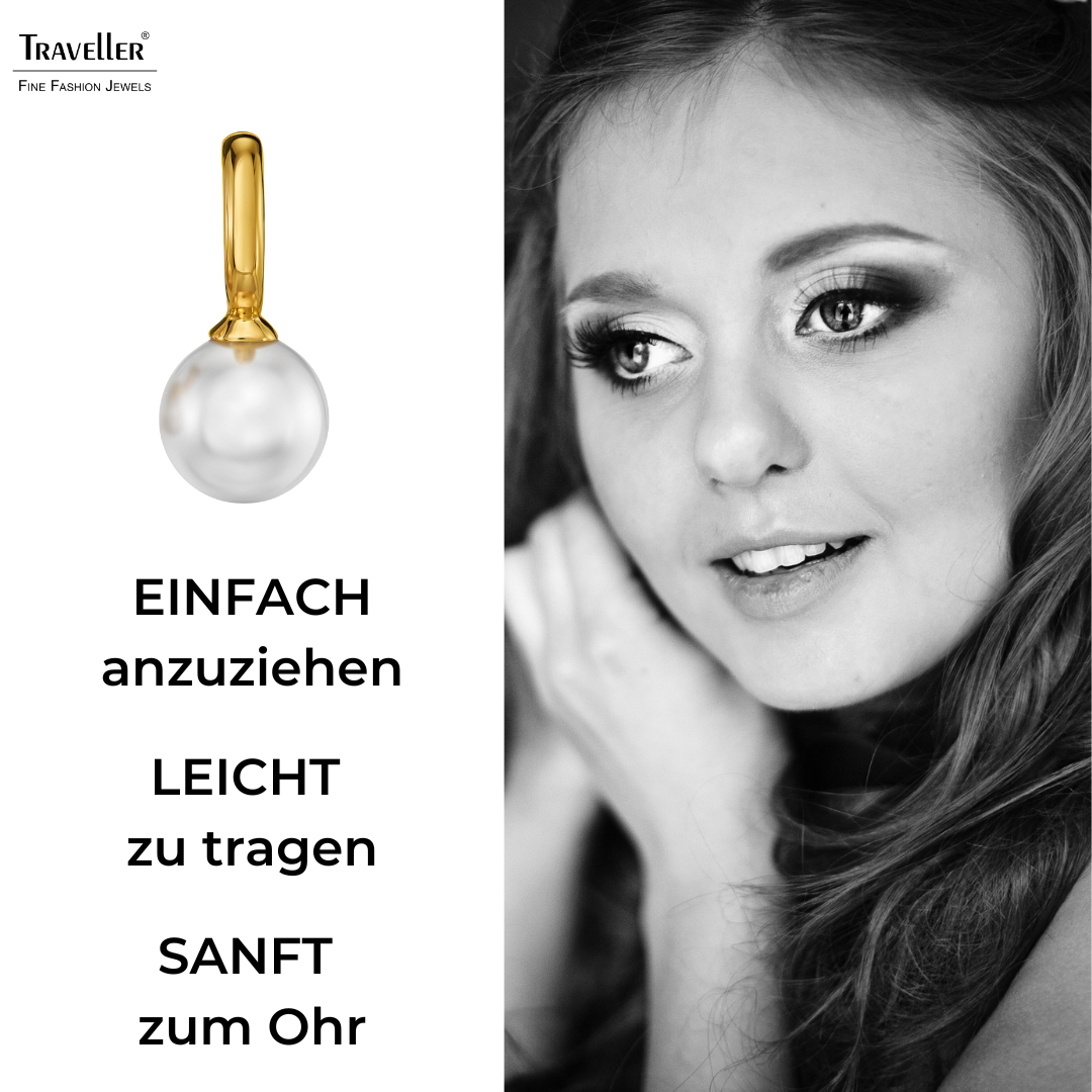 Ohrringe von Traveller in klassischem und zeitlosem Design. Diese Ohrringe passen zu jedem Outfit und lassen Sie immer strahlen! An dem mit 22 Karat vergoldeten Ohrstecker hängt eine hochwertige, weiße Perlenimitation, die von der für ihre Perlen bekannten Insel Mallorca stammt. Die Ohrringe sind insgesamt 20 x 10 Millimeter groß und wiegen jeweils 2,5 Gramm.