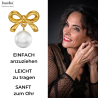 Ein festliches, schickes Paar Perlenohrringe von Traveller. An einer Schleife hängt eine weiße, hochwertige Perlenimitation aus Mallorca - einer Insel, die für ihre Perlen bekannt ist. Die Schleife ist mit 22 Karat Gold vergoldet. Die Ohrringe sind 17 x 14 Millimeter groß und wiegen nur 1,65 Gramm pro Ohrring. Da die Ohrstecker aus antiallergischem Titan gefertigt sind, kann jeder die Ohrringe (wieder) tragen!
