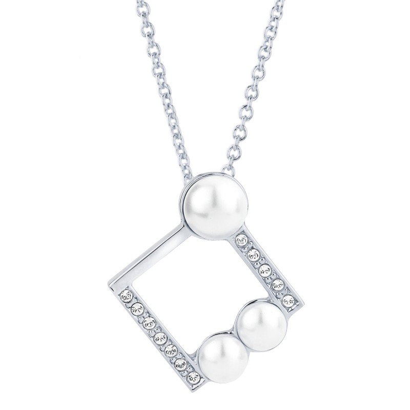 Ein einzigartiges Design von Traveller. Der platinierte Anhänger der Kette hat die Form eines Quadrats, ist auf zwei Seiten mit Preciosa-Kristallen besetzt und hat drei hochwertige Imitationsperlen aus Mallorca. Der Anhänger ist 28 x 25 Millimeter groß, die Kette wiegt 7,5 Gramm. Die Kette ist verstellbar, sodass Sie selbst entscheiden können, in welcher Länge Sie sie tragen möchten. Die Kette hat eine Mindestlänge von 38 Zentimetern und kann mit zwei Verlängerungsstücken von jeweils 3 Zentimetern auf eine maximale Länge von 44 Zentimetern verlängert werden. Vervollständigen Sie den Look mit den passenden Ohrclips (Referenz 114178)!