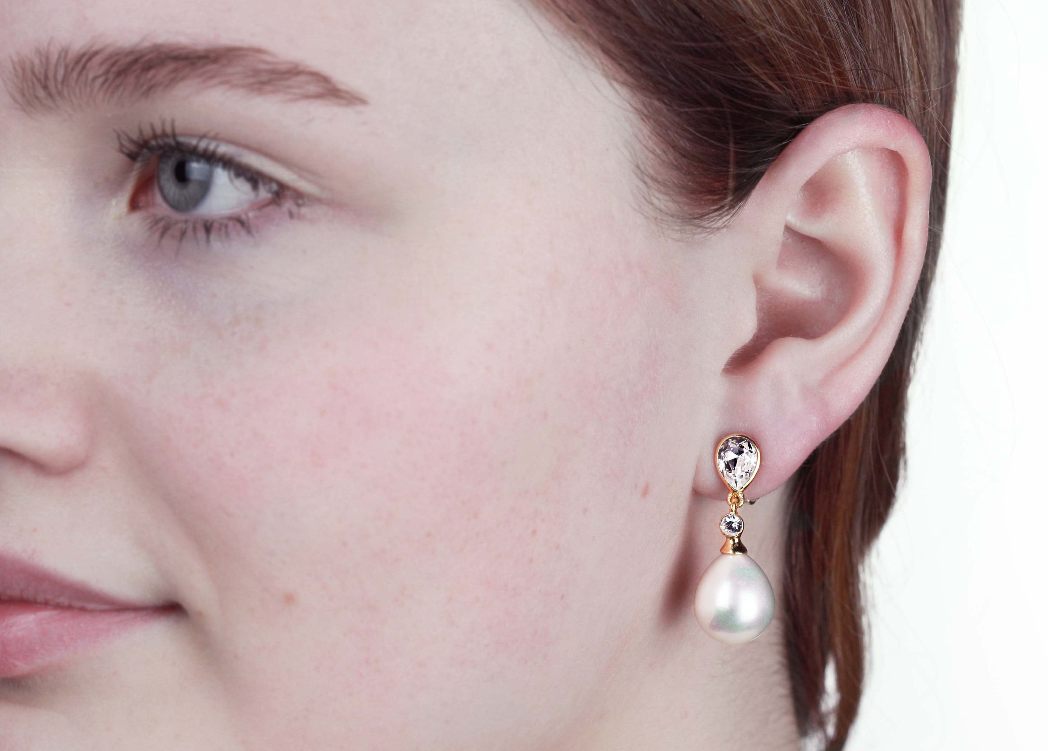 Perlen und Kristalle machen diese Ohrclips von Traveller zu einem Paar wunderschöner Accessoires. Die mit 22 Karat vergoldeten Ohrringe sind mit Kristallen von Preciosa und einer tropfenförmigen, hochwertigen Perlenimitation von der für ihre Perlen bekannten Insel Mallorca besetzt. Die weiße Perle misst 15 x 12 Millimeter, die Ohrringe sind insgesamt 32 x 12 Millimeter groß. Dank des einzigartigen Verschlusssystems von Traveller sind diese Ohrclips sehr bequem, leicht und sicher zu tragen.