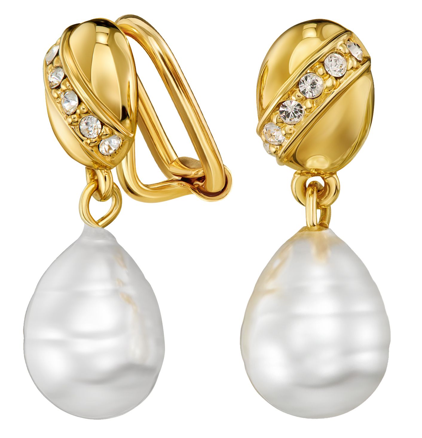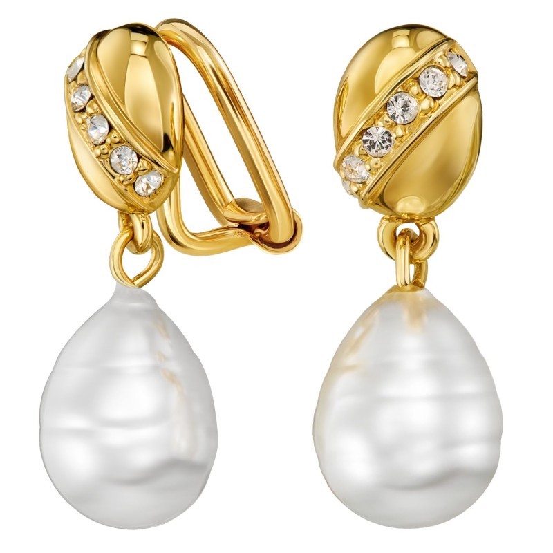Traveller Ohrclip - Hänger - Vergoldet - Barock Perle - Weiss - Kristalle - 23x8 mm