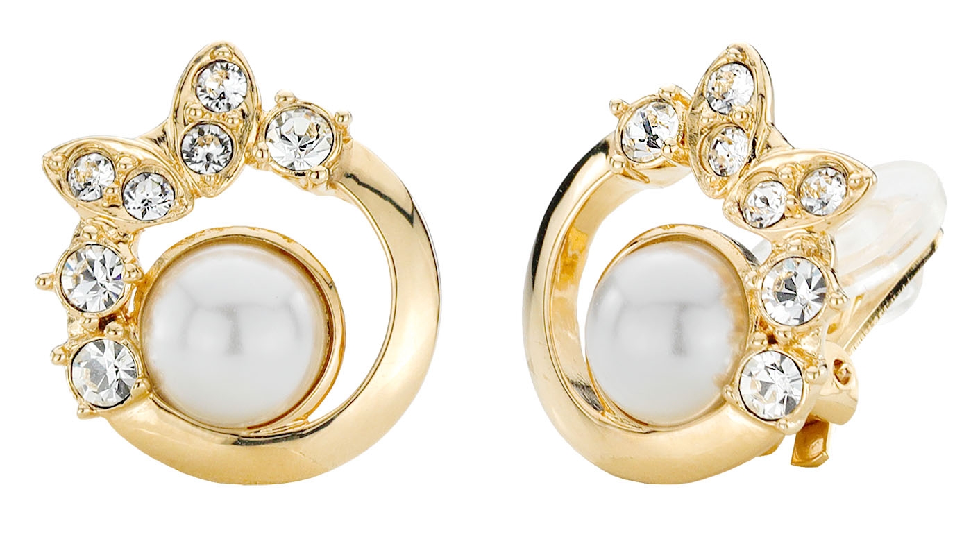 Traveller Ohrclip - Vergoldet - Perle - 8mm - Weiß - Kristalle - 20x20 mm