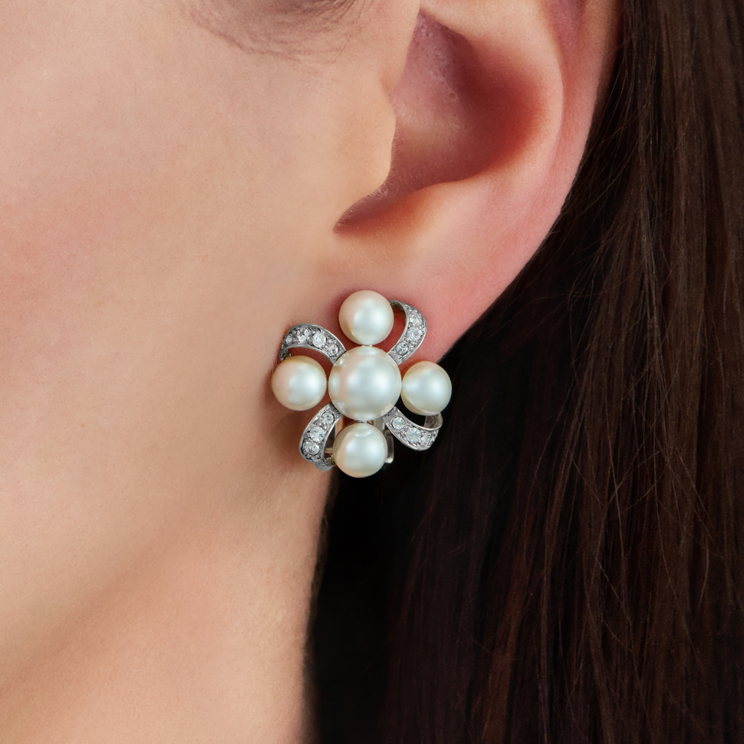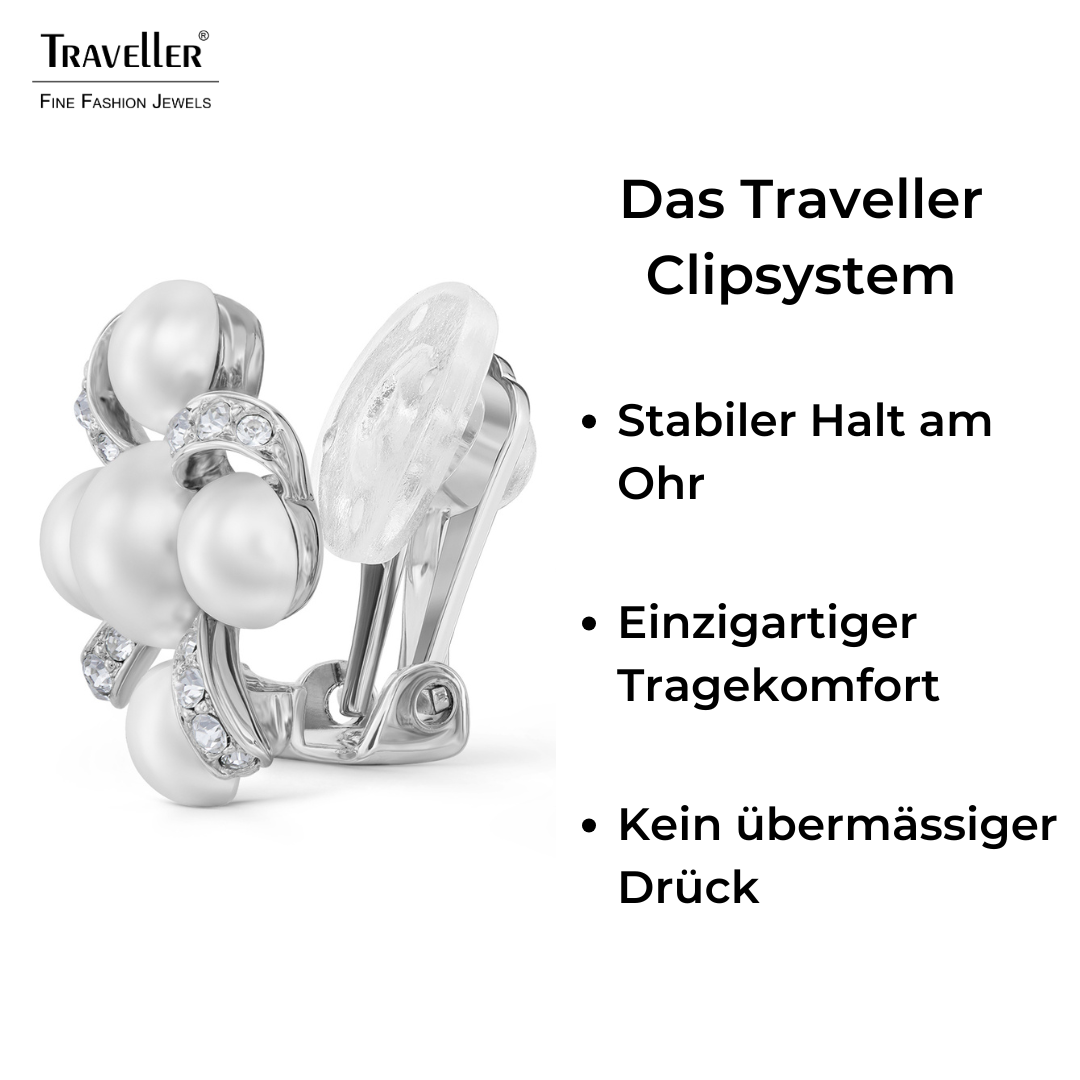 Traveller Ohrclips - Silberfarben - Perle - 8&6mm - Weiß - Kristalle - Platiniert - 20x20mm