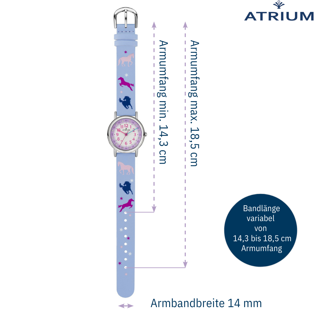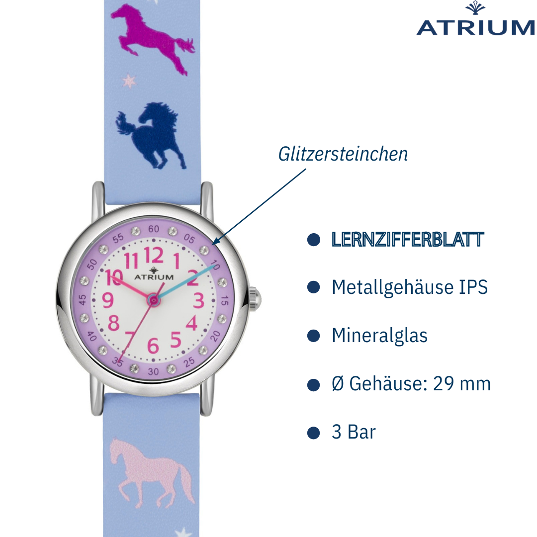 Die süße Kinderarmbanduhr A47-12 von ATRIUM ist ein echter Mädchentraum: dezente Flieder- und Lilatöne zusammen mit den hübschen Pferdemotiven machen die Uhr zu einem tollen Hingucker am Handgelenk. Und das Highlight sind die kleinen funkelnden Glitzersteinchen auf dem Zifferblatt. Zudem hat die Uhr ein übersichtliches Lernzifferblatt, das das Uhrzeit Lernen und Ablesen vereinfacht.