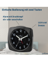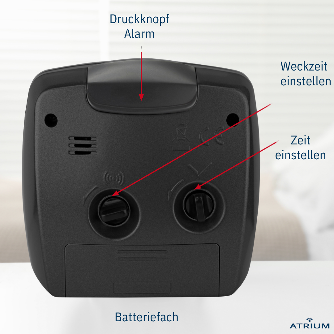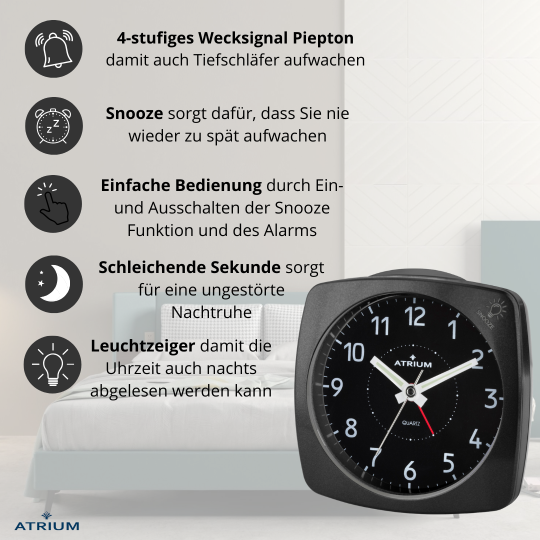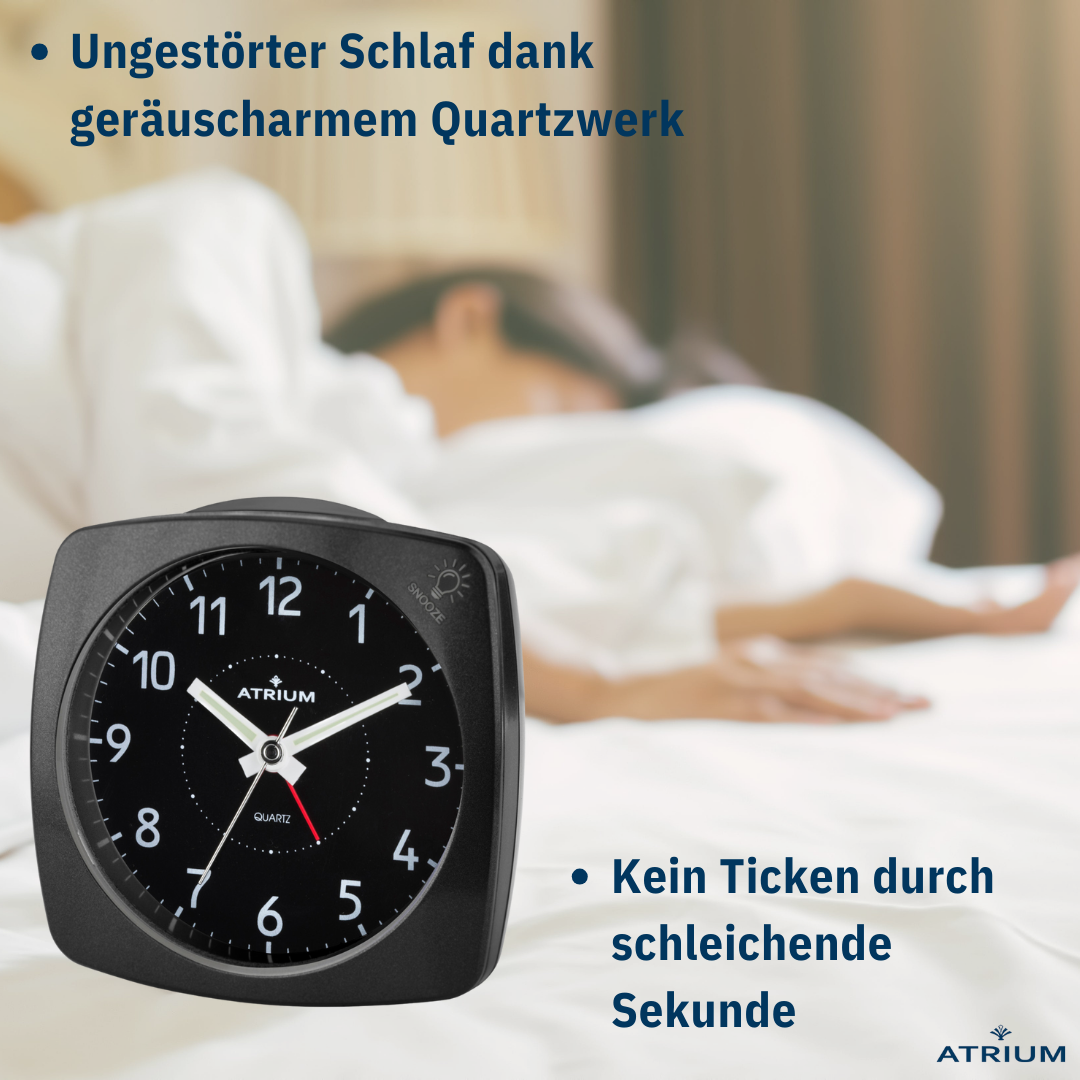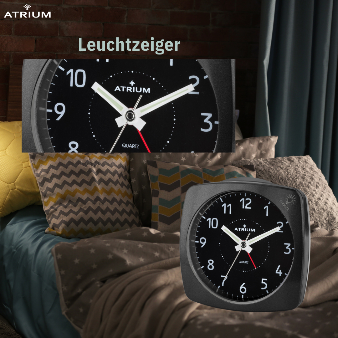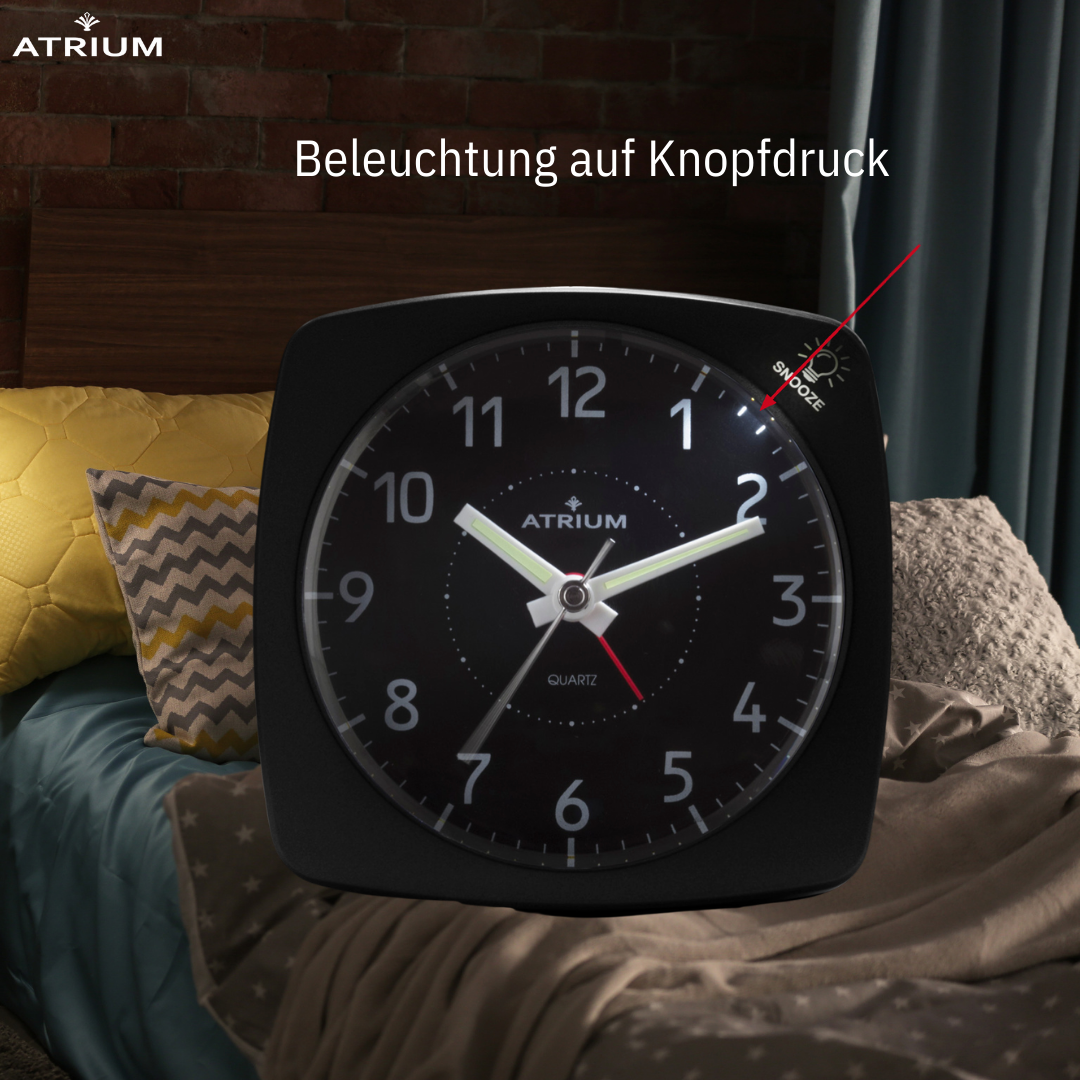 Der elegante und klassische schwarzfarbene Metallwecker A251-7 von ATRIUM verfügt über eine Taste zum Ausschalten des Weckers, eine Schlummerfunktion und ein Licht, das beim Ertönen des Weckers blinkt. Die Schlummerfunktion und das Licht werden durch Drücken des Gehäuserandes aktiviert. Das leise Quarzwerk mit nachlaufendem Sekundenzeiger sorgt für eine ungestörte Nachtruhe. Griffige Einstellknöpfe auf der Rückseite erleichtern die Bedienung.
