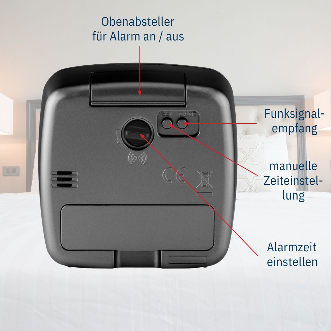 Der gut greifbare Einstellknopf auf der Rückseite und der große Schiebeschalter oben für den Alarm erleichtern die Bedienbarkeit des Weckers - auch ideal geeignet für Senioren.