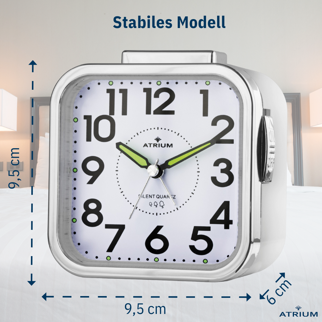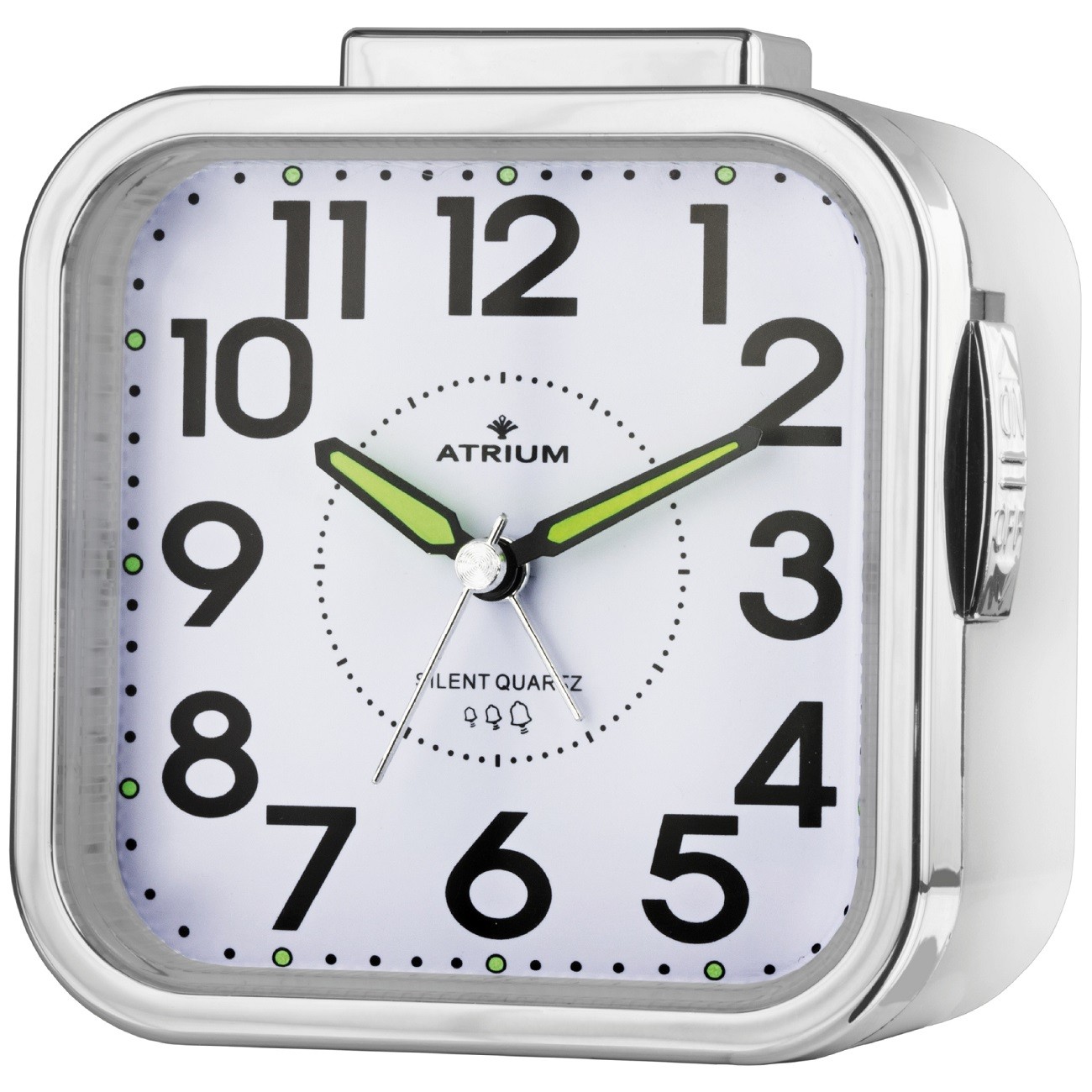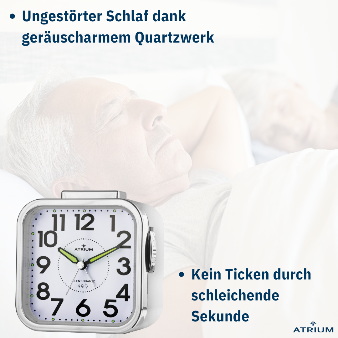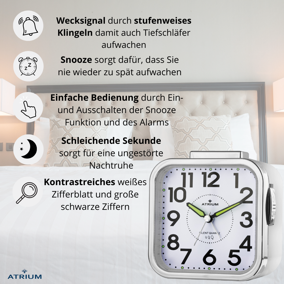 Der klassische Wecker von ATRIUM weckt Sie mit einem ansteigenden Wecksignal. Das bedeutet, dass die Glocke zunächst in einem langsamen Intervall ertönt und dann immer schneller und damit intensiver wird. Das mildes Licht und die "glow-in-the-dark" Zeiger sorgen dafür, dass die Uhrzeit auch im Dunkeln ablesbar ist. Das Licht geht an, wenn der Knopf gedrückt wird. Die Ziffernblätter sind leicht zu ertasten, was, ebenso wie die großen Ziffern, die Bedienung des Weckers erleichtert. Die Schlummerfunktion kann so eingestellt werden, dass sie innerhalb von 5 Minuten 6 Mal wiederholt wird. Außerdem sorgt das geräuscharme Quarzwerk für einen ungestörten Schlaf.
