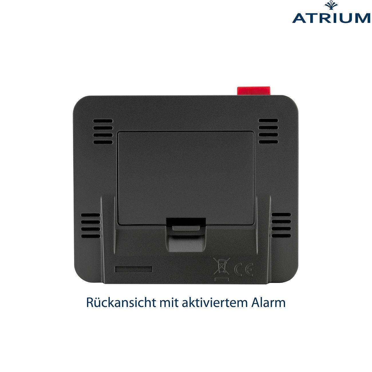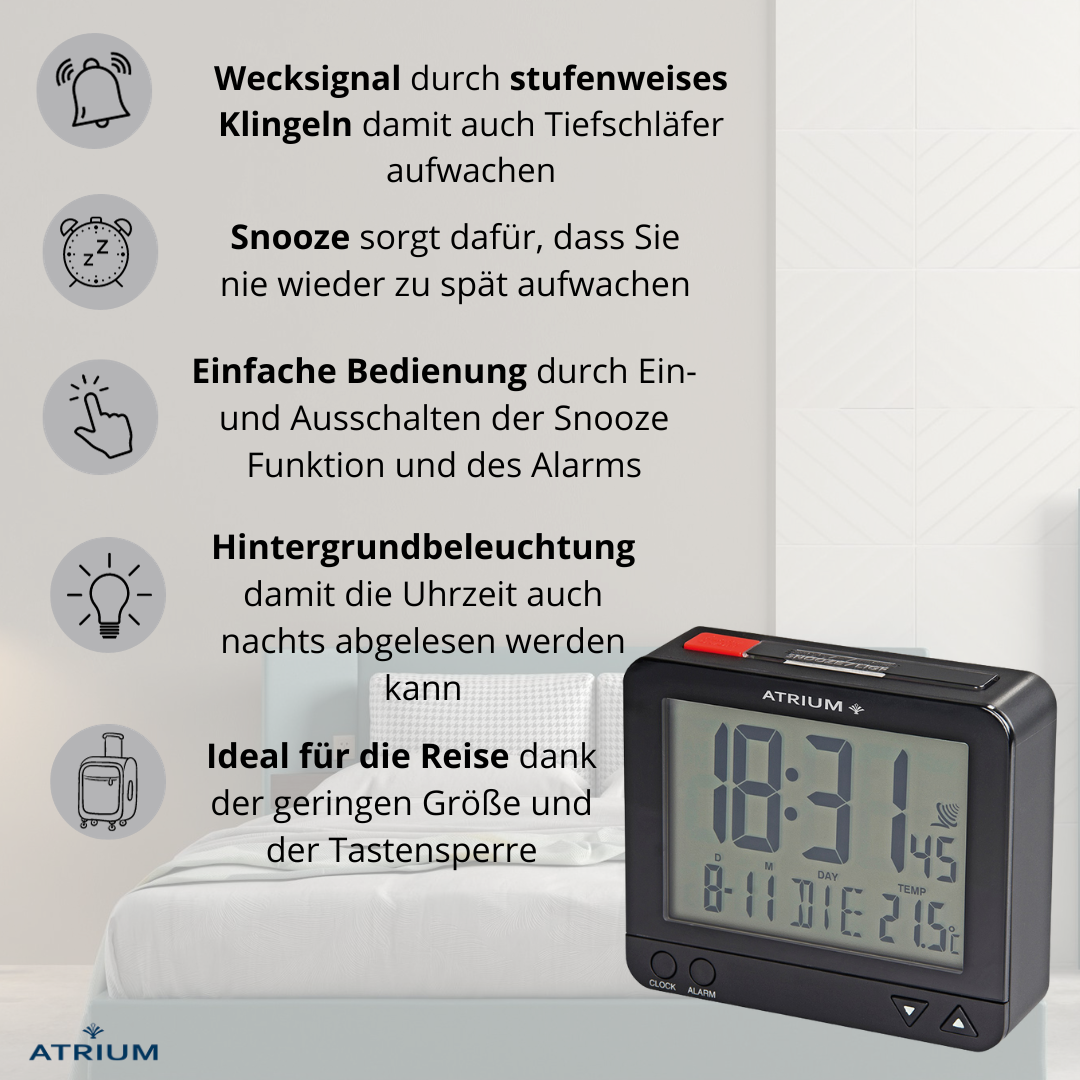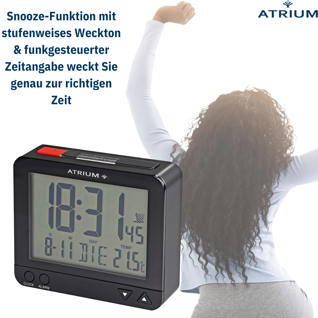 Der am besten durchdachte Wecker von ATRIUM! Sowohl der markante rote Schalter auf der Oberseite als auch die Einstelltasten auf der Vorderseite machen den Wecker leicht bedienbar. Das Licht kann durch Drücken der Taste für 5 Sekunden aktiviert werden. Außerdem gibt es eine sensorgesteuerte Hintergrundbeleuchtung, die nach Belieben eingeschaltet werden kann: Der intelligente Lichtsensor erfasst dabei die Helligkeit des Raumes und aktiviert automatisch eine permanente dezente Beleuchtung im Dunkeln. Die Snooze-Funktion kann innerhalb von 5 Minuten 4 Mal wiederholt werden. Das Display zeigt die Uhrzeit (12- oder 24-Stunden-Format), das europäische Datum, den Wochentag in Englisch/Französisch/Deutsch/Spanisch/Italienisch, die Raumtemperatur und die eingestellte Weckzeit an. Sie empfängt das Signal über das Zeitsignal DCF77 bei Frankfurt. Zeiteinstellung und Sommer-/Winterzeitumstellung erfolgen daher automatisch.