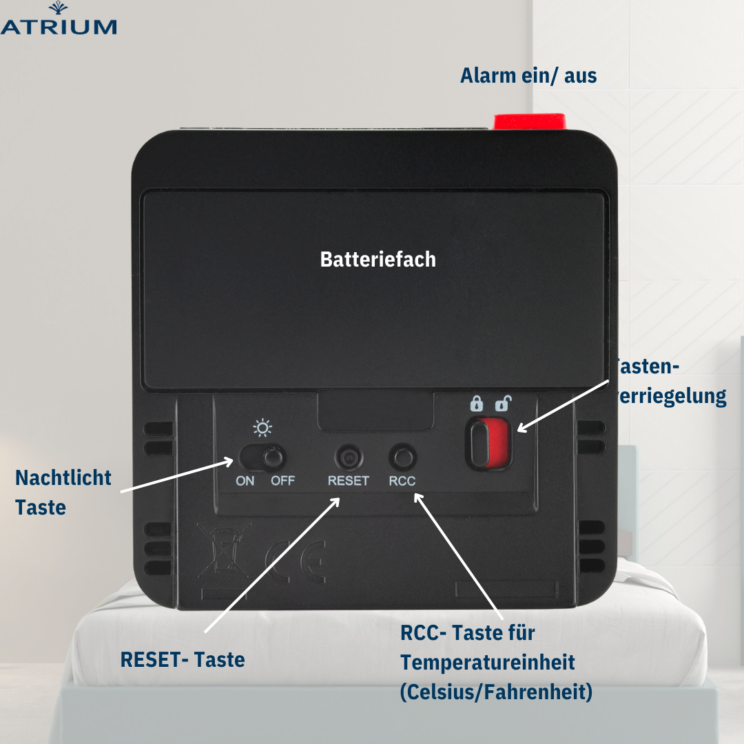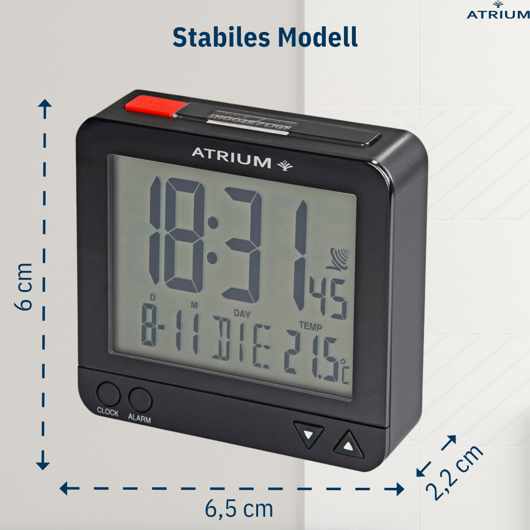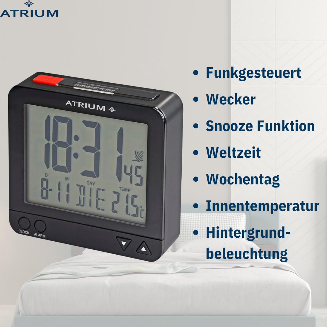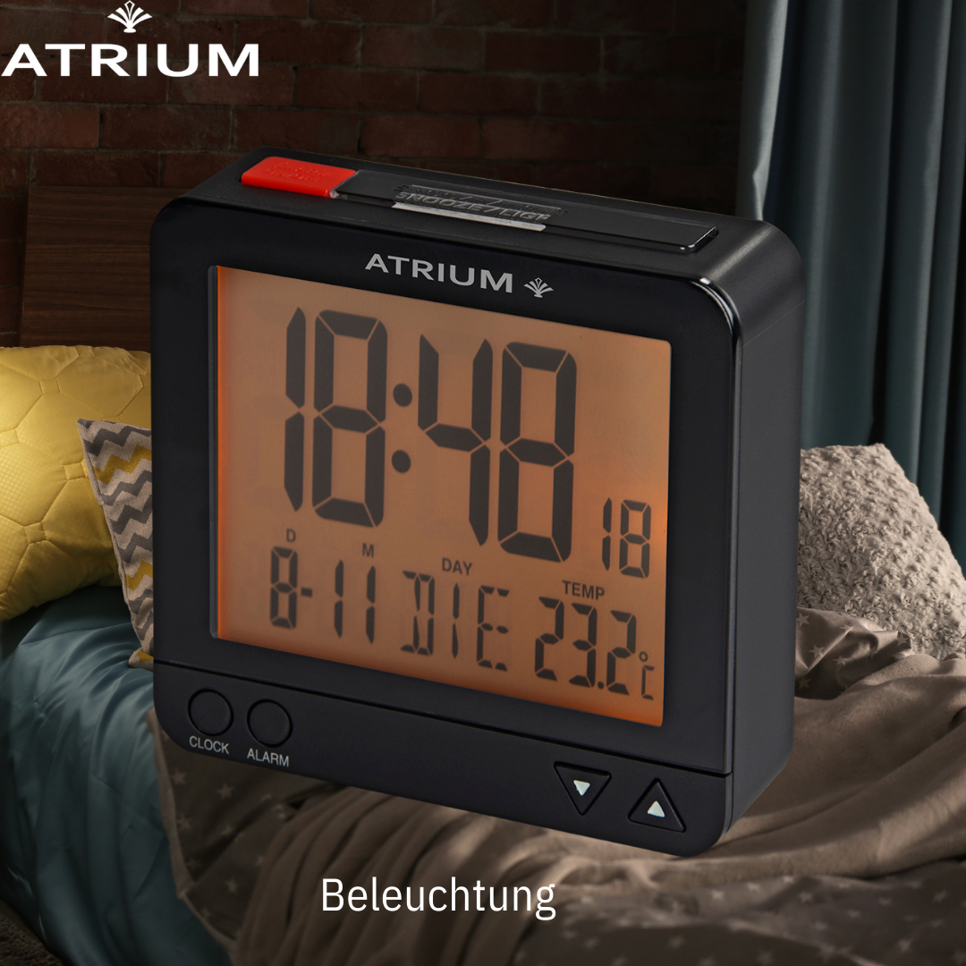 Der am besten durchdachte Wecker von ATRIUM! Die handliche Größe des Weckers zeichnet dieses Modell aus. Der markante rote Schalter auf der Oberseite und die Einstelltasten auf der Vorderseite machen den Wecker leicht bedienbar. Das Licht kann durch Drücken der Taste für 5 Sekunden aktiviert werden. Außerdem verfügt der Wecker über eine sensorgesteuerte Hintergrundbeleuchtung, die sich nach Belieben einschalten lässt: Der intelligente Lichtsensor erfasst dabei die Helligkeit des Raumes und aktiviert automatisch eine dezente Dauerbeleuchtung im Dunkeln. Die Snooze-Funktion kann innerhalb von 5 Minuten 4 Mal wiederholt werden. Das Display zeigt die Uhrzeit (12- oder 24-Stunden-Format), das europäische Datum, den Wochentag in Englisch/Französisch/Deutsch/Spanisch/Italienisch, die Raumtemperatur und die eingestellte Weckzeit an. Der Wecker empfängt das Signal über das Zeitsignal DCF77 in Frankfurt. Die Zeiteinstellung und die Sommer-/Winterzeitumstellung erfolgen daher automatisch.