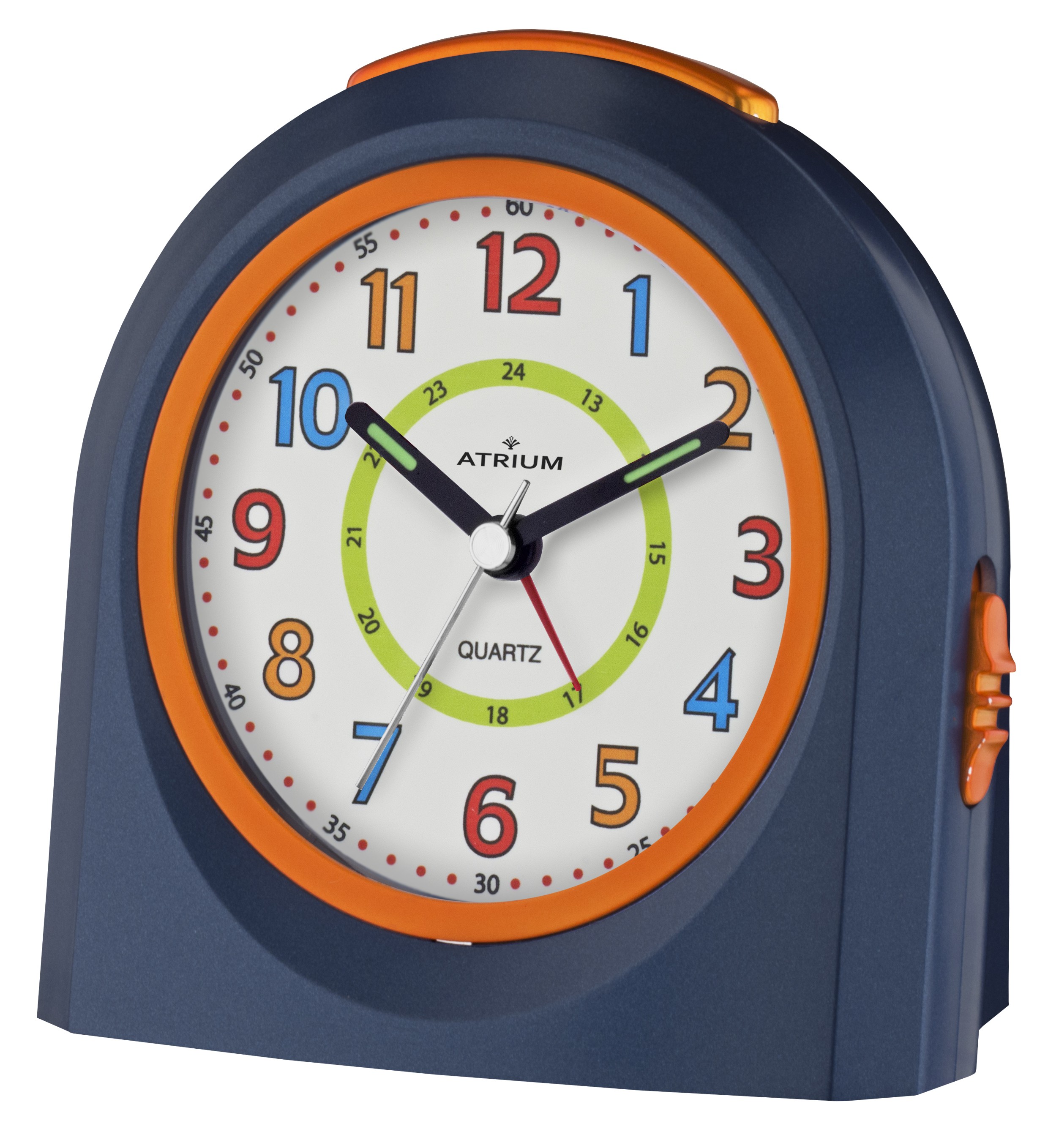 Der fröhliche blaue Wecker von ATRIUM verfügt über eine Snooze-Funktion und eine LED-Beleuchtung, die nach dem Einschalten für 5 Sekunden aufleuchtet und dann automatisch erlischt. Das übersichtliche Ziffernblatt mit bunten Zahlen und Minutenanzeige erleichtert das Ablesen der Uhrzeit. Die geräuschlose Quarzuhr sorgt für eine ungestörte Nachtruhe.