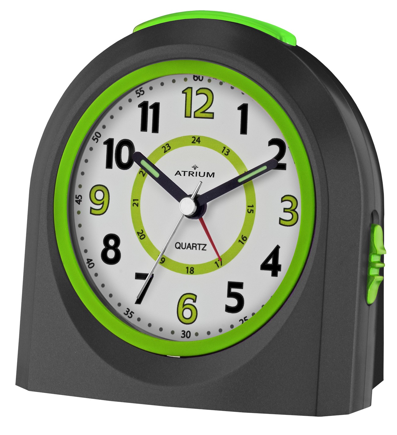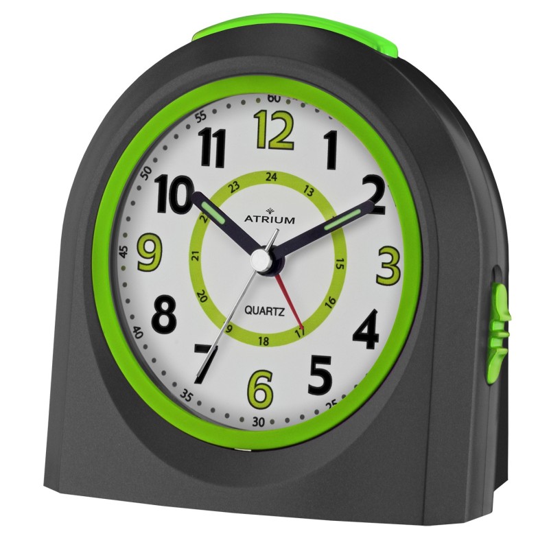 Der fröhliche schwarze Wecker von ATRIUM verfügt über eine Schlummerfunktion und LED-Leuchten, die nach dem Einschalten 5 Sekunden lang leuchten. Das klare Ziffernblatt mit farbigen Ziffern und Minutenanzeige erleichtert das Ablesen der Uhrzeit. Die geräuschlose Quarzuhr sorgt für eine ungestörte Nachtruhe.