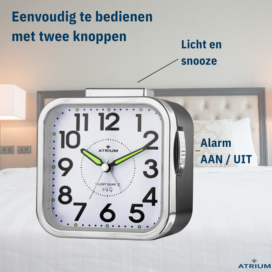 ATRIUM's classic alarm clock wakes you up with a rising wake-up signal. This means that the bell first sounds at a slow interval and then gets faster and faster and thus more intense. The soft light and "glow-in-the-dark" hands ensure that the clock time is legible in the dark. The light comes on when the button is pressed. The dials are easy to feel, which, like the large digits, makes operating the alarm easy. The snooze function can be set to repeat 6 times in 5 minutes. Furthermore, the low-noise Quartz movement ensures undisturbed sleep.