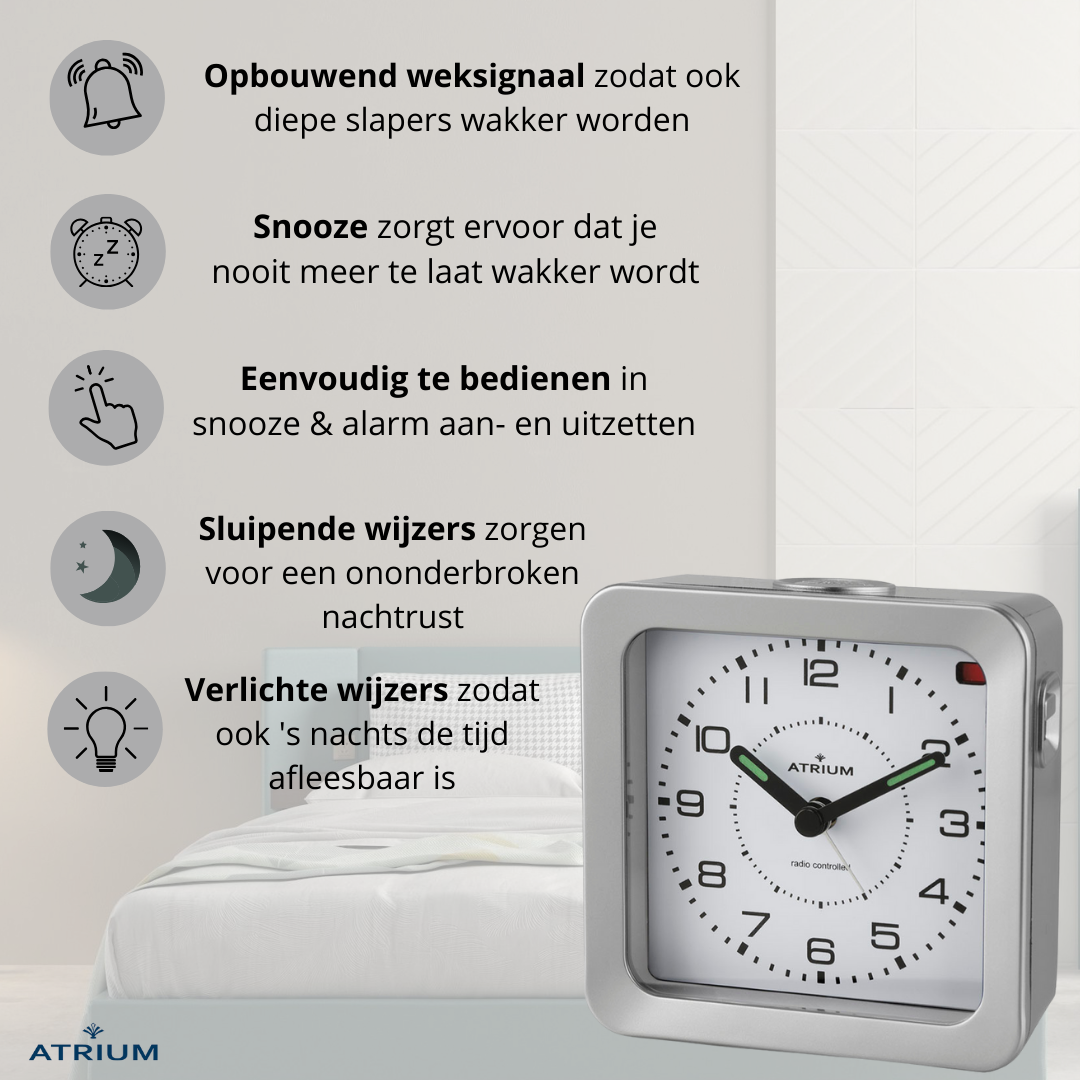 ATRIUM Alarm Clock - Radio-controlled- Analogue - Silver - Buidl-up Beep - Snooze - Easy to use €27.90
