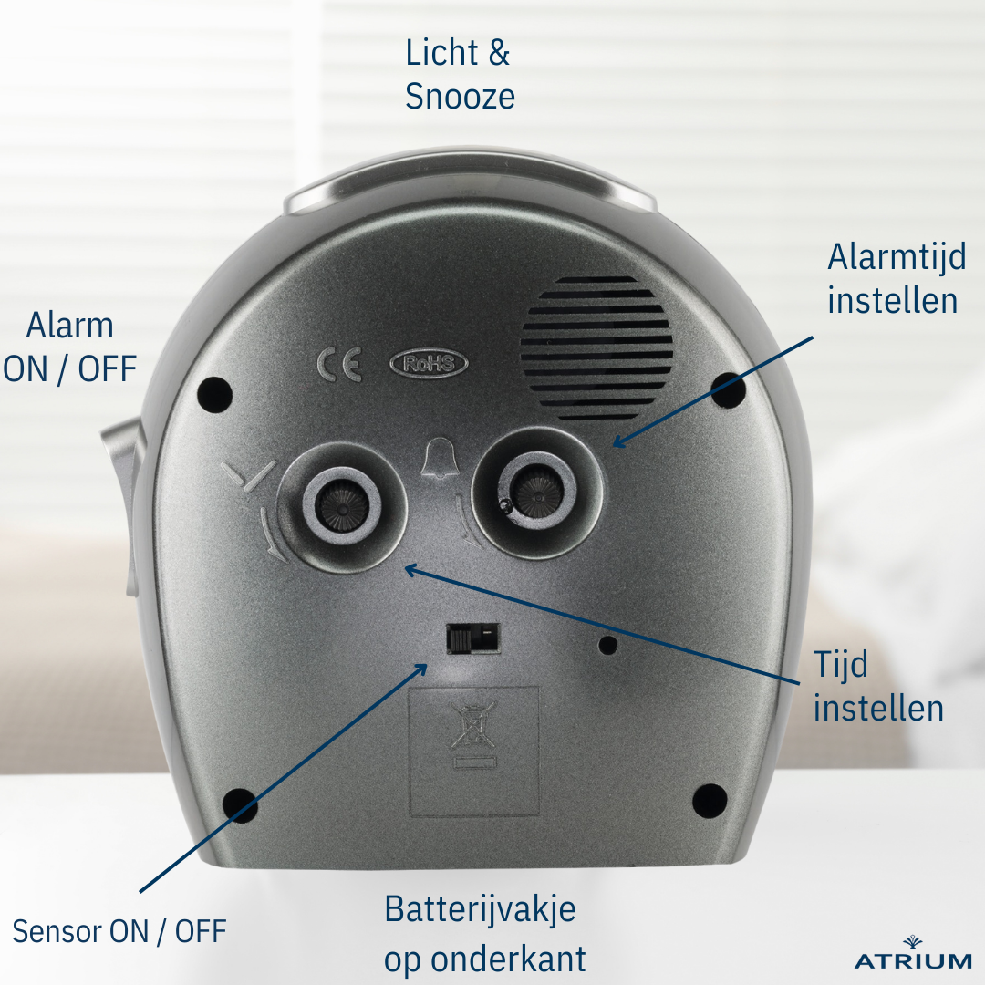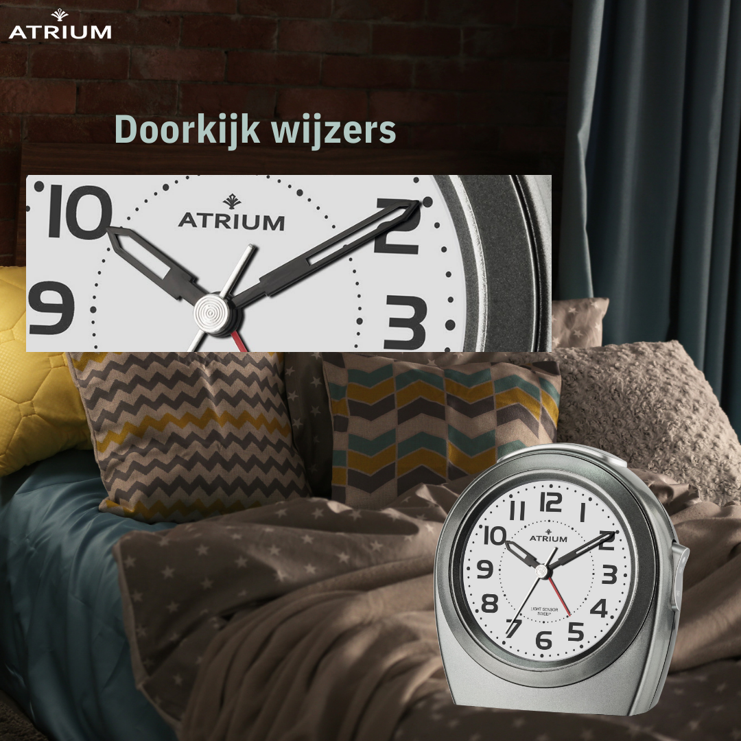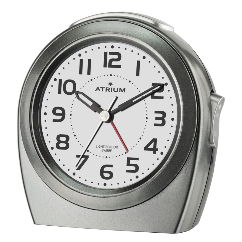 This classic ATRIUM alarm clock in an elegant shape has an 'autolight'. When the switch on the back is activated, the backlight is automatically switched on when dusk falls. Large, high-contrast black numbers facilitate reading the time. The special shape of the hands completes the tasteful and clear design of the dial. The modern, anthracite-grey housing also makes the quartz alarm clock very suitable as a table clock or decoration in the study. When the alarm is switched on, the alarm clock wakes you up with an easily audible, build-up beeping sound. The alarm is easy to switch on and off. Thanks to the trailing seconds hand, the alarm clock is completely silent and does not tick. The light and snooze function can be practically activated via the button on top. Grip-proof setting buttons on the back ensure easy operation.