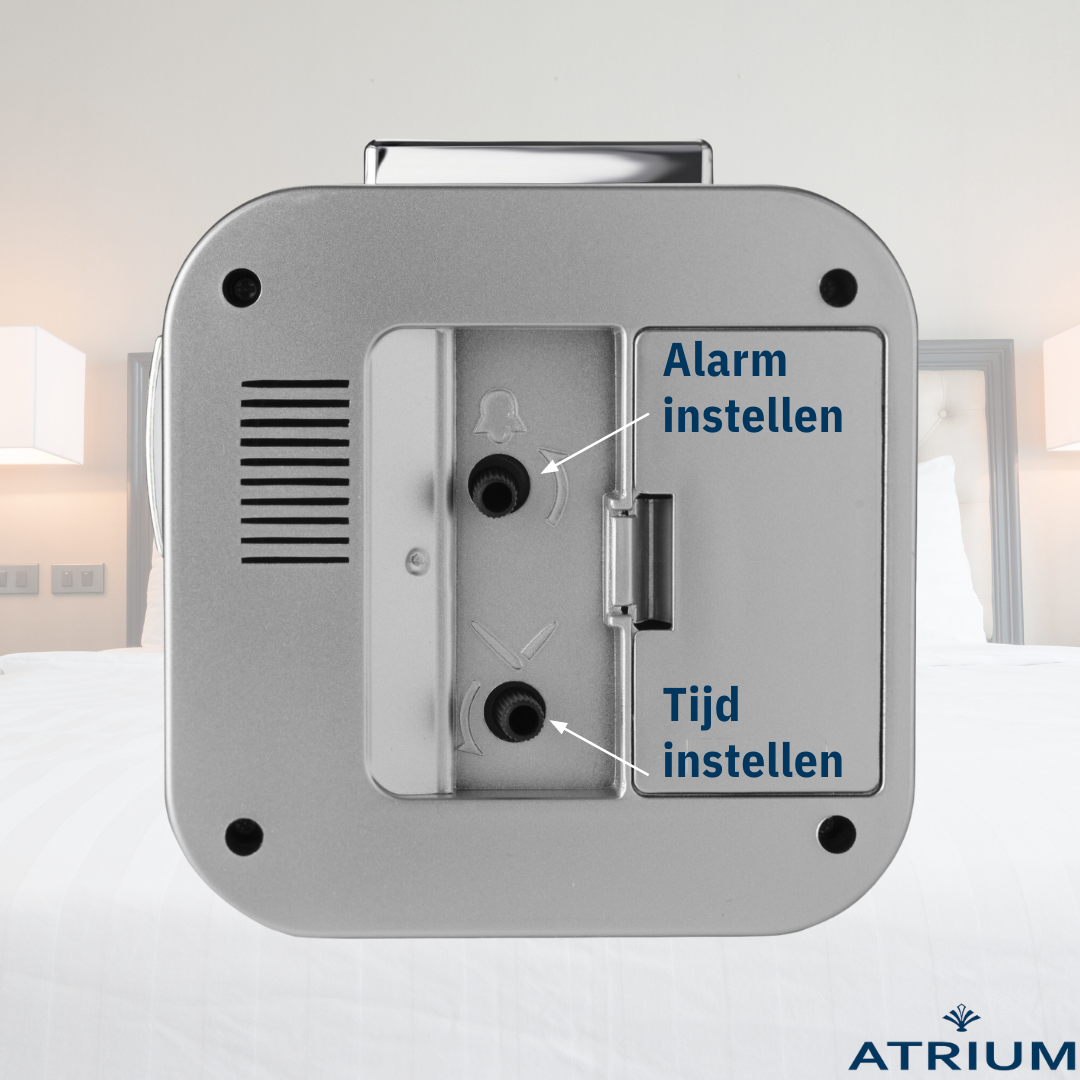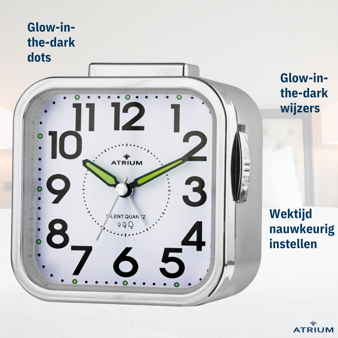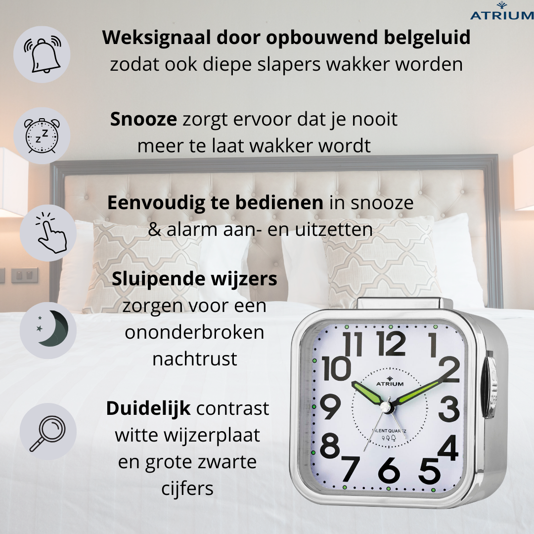 ATRIUM's classic alarm clock wakes you up with a rising wake-up signal. This means that the bell first sounds at a slow interval and then gets faster and faster and thus more intense. The soft light and "glow-in-the-dark" hands ensure that the clock time is legible even in the dark. The light comes on when the button is pressed. The control buttons are easy to feel which, like the large digits, makes it easy to operate the alarm clock. The snooze function can be set to repeat 6 times in 5 minutes. Furthermore, the low-noise Quartz movement ensures undisturbed sleep.