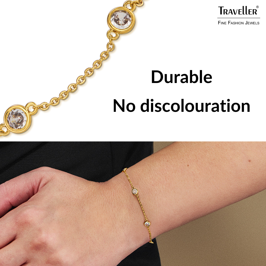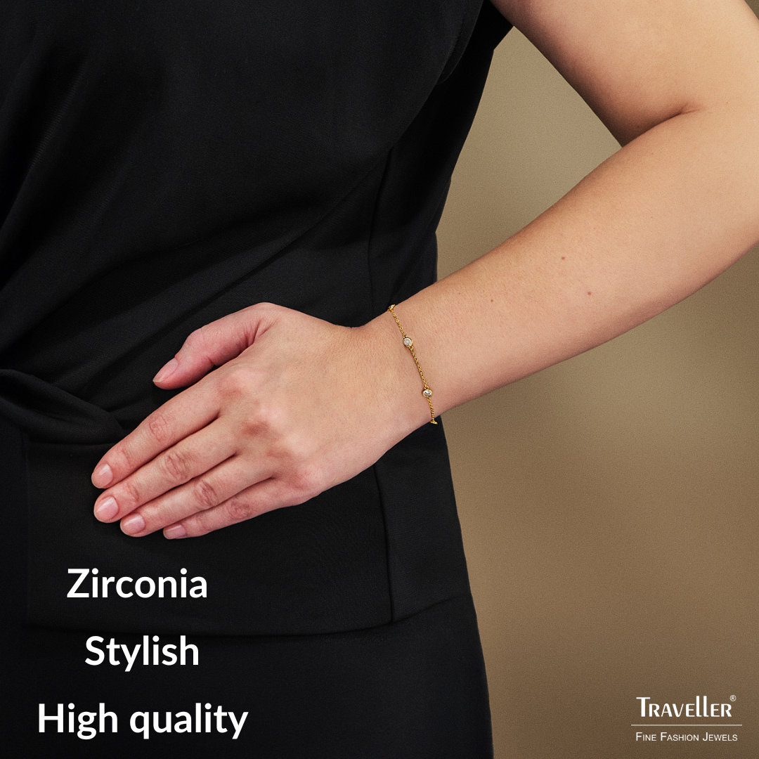 Subtle, classic and radiant. That's what this bracelet from Traveller is. The gold coloured bracelet is fully gold plated with 22 carat gold and contains 5 beautifully radiant zirconia. The bracelet is 17 centimetres long and has 2 extension pieces of 1.5 centimetres so that it can be worn at the desired length. The bracelet weighs about 2 grams. Complete it with the matching necklace (157758)v and drop earrings (157762)!