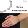 This silver coloured stainless steel Traveller bracelet has a beautiful design of strung together shiny ovals. These ovals measure 5 x 6 millimeters, and the bracelet is 17 centimeters long with a 4 centimeter extension, allowing it to be worn at two different lengths. The bracelet is beautiful worn on its own, but also pairs beautifully with the matching necklace (181313).