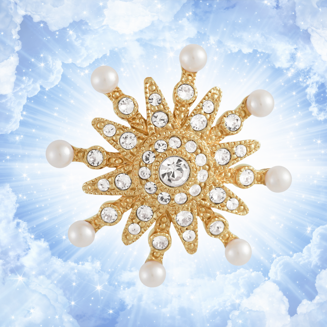 Grossé Brooch - Celestial - Gold Coloured - Sun / Star - Pearls - White - Crystals - Gold Plated - Ø 3 cm