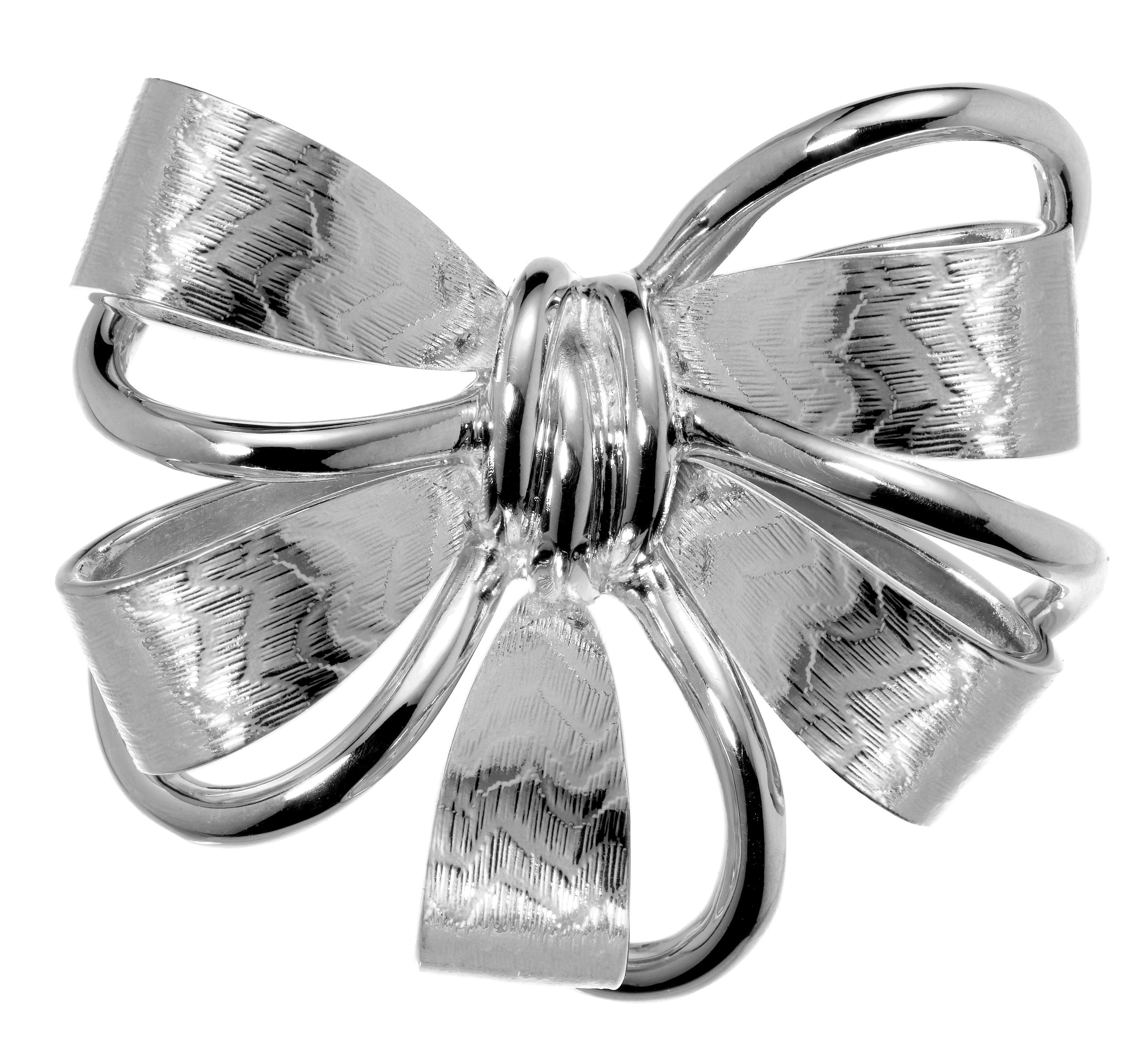 This silver coloured, fully platinum plated, bow-shaped brooch is a beautiful addition to any outfit. The brooch measures 3.5 by 4.2 centimetres and weighs 22.5 grams.