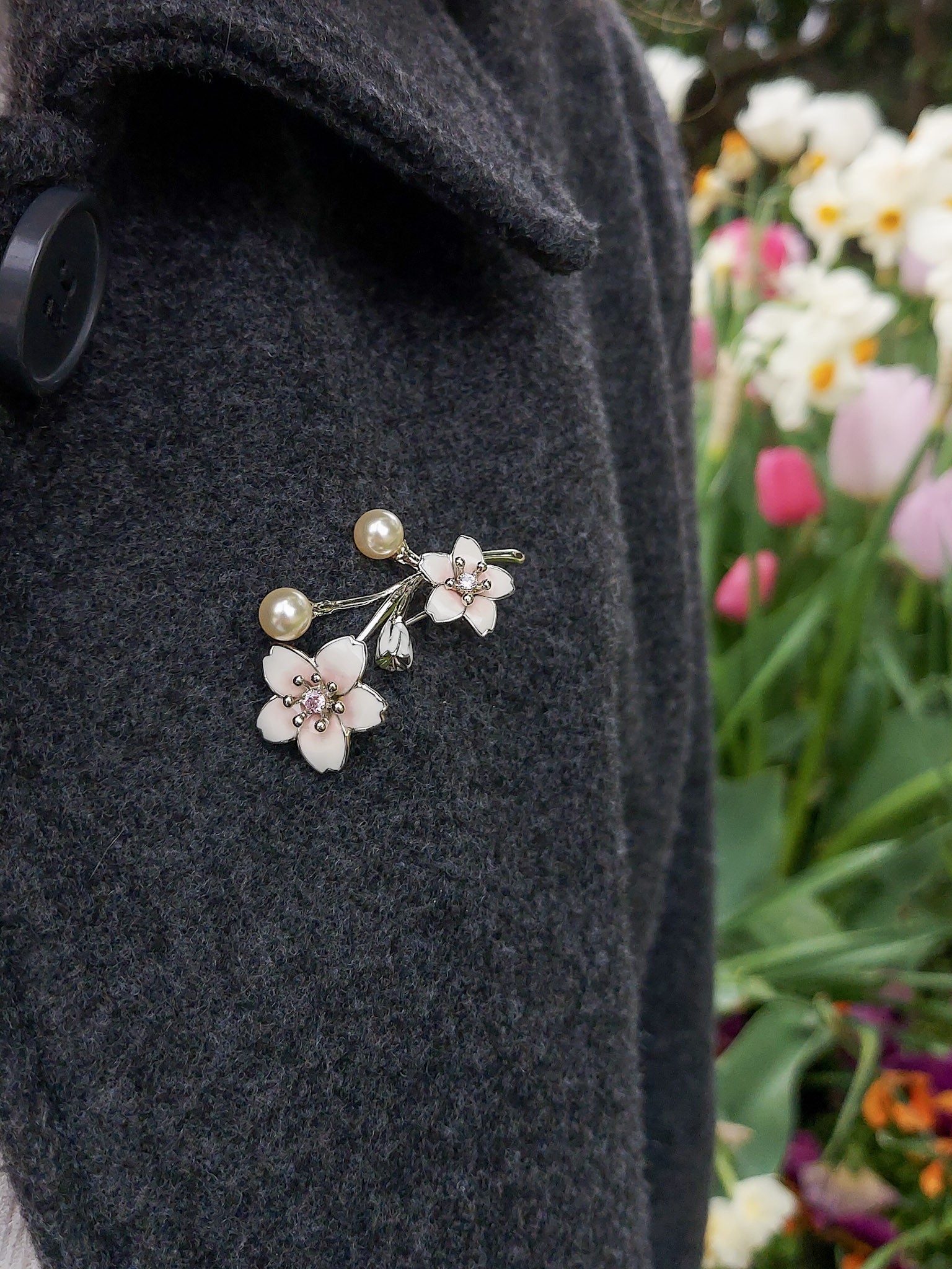 Grossé Brooch - Sakura - Platinum Plated - Cherry Blossom - White Pearl - Zirconia - Enamel Leaves
