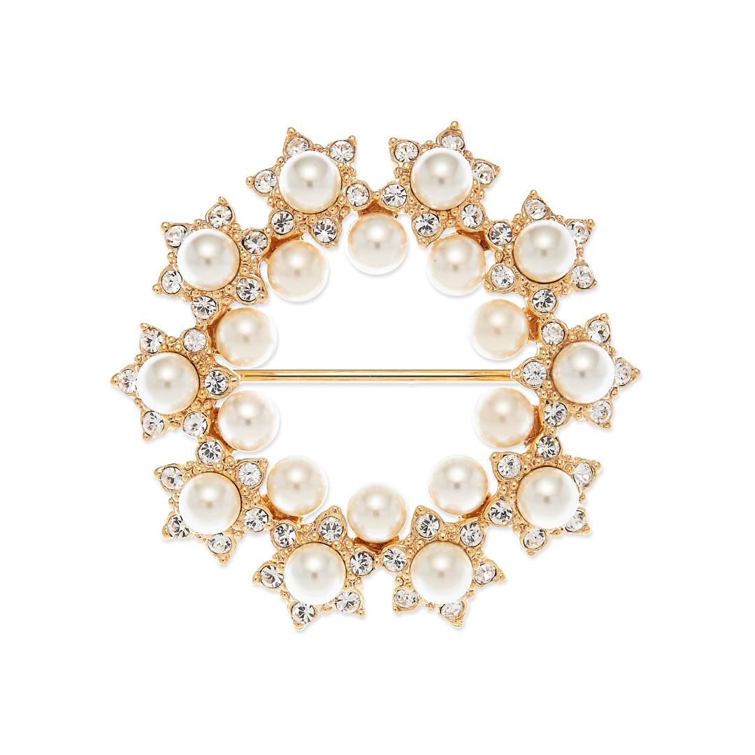 This festive brooch is a real eye-catcher thanks to the gorgeous pearls and dazzling crystals incorporated into its design. A circle of stars with an inner edge of elegant pearls makes this brooch a graceful addition to numerous outfits. Beautiful white pearls are used as stars, surrounded by a border of sparkling crystals. It is attached via a pin with safety lock. The gold coloured brooch has a diameter of 35 millimeters and weighs 10.25 grams.