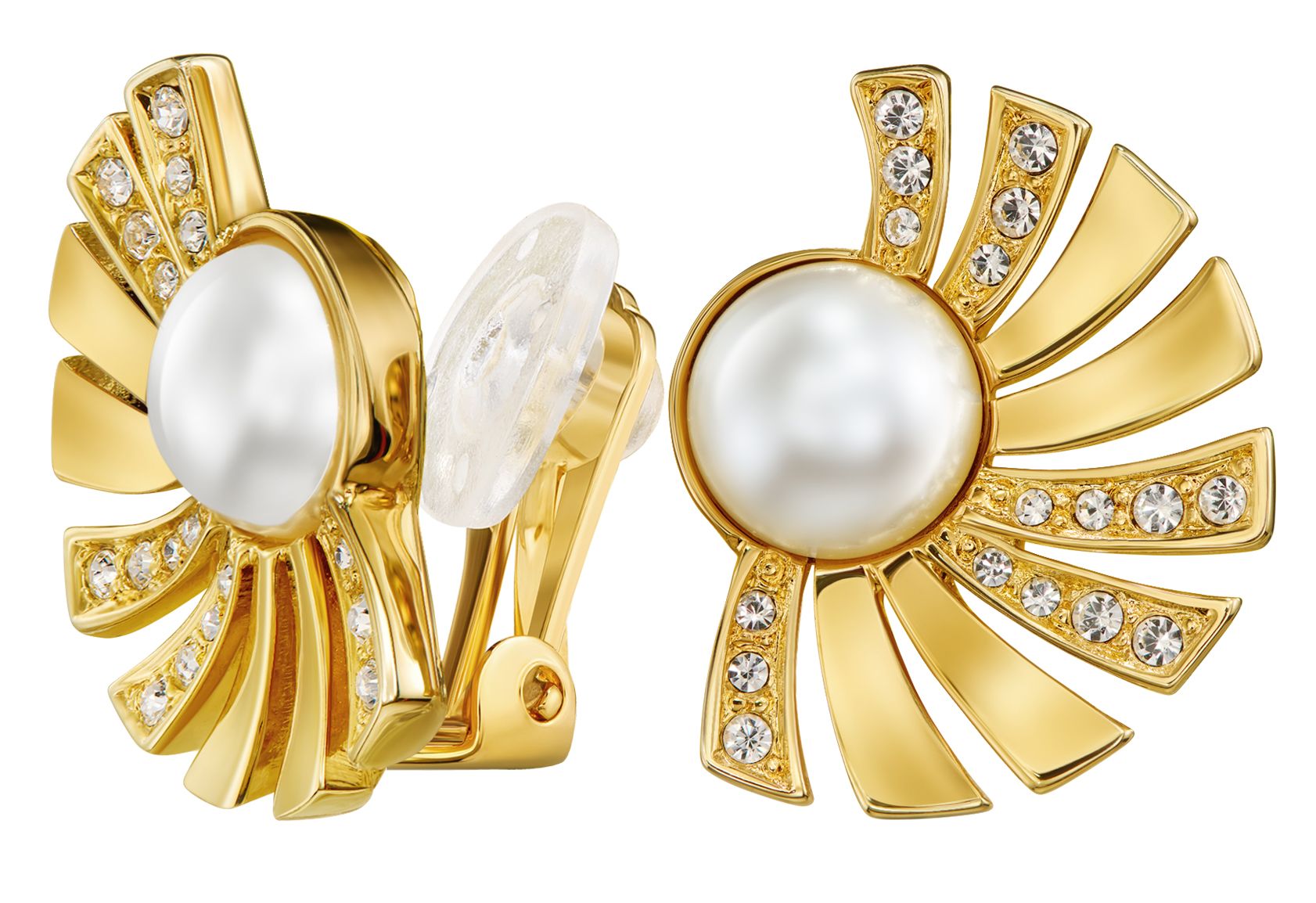These charismatic clip-on earrings from Traveller have a fan shape. The first, second, fifth, sixth and ninth segments are studded with Preciosa crystals, while the remaining segments have a shiny gold colour. In the centre of the fan is a high-quality imitation pearl, sourced from Mallorca – an island known for its pearls. The earrings are fully plated with 22-carat gold (core material metal) and weigh only 3.5 grams each. Thanks to Traveller's unique fastening system, our clip-on earrings are very comfortable, light and safe to wear.