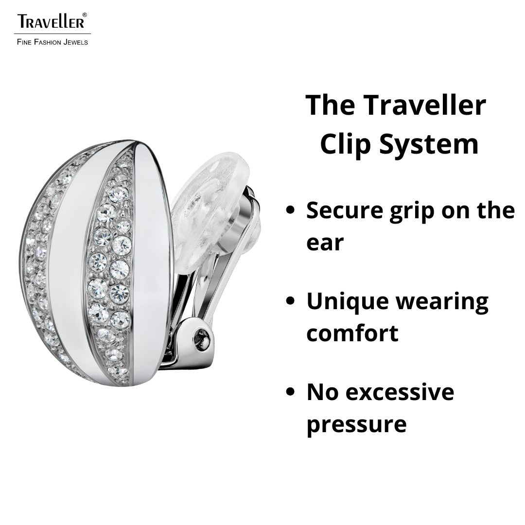 These elegant silver coloured clip-on earrings from Traveller will sparkle on your ears. The spherical platinum plated earrings feature alternating bands of platinum studded with Preciosa crystals and shiny white enamel. The clips measure 2 x 2 millimetres and weigh 8 grams each. Thanks to Traveller's unique fastening system, these clip-on earrings are very light, comfortable and safe to wear. Thanks to Traveller's unique closure system, these clips are very light, comfortable and safe to wear.