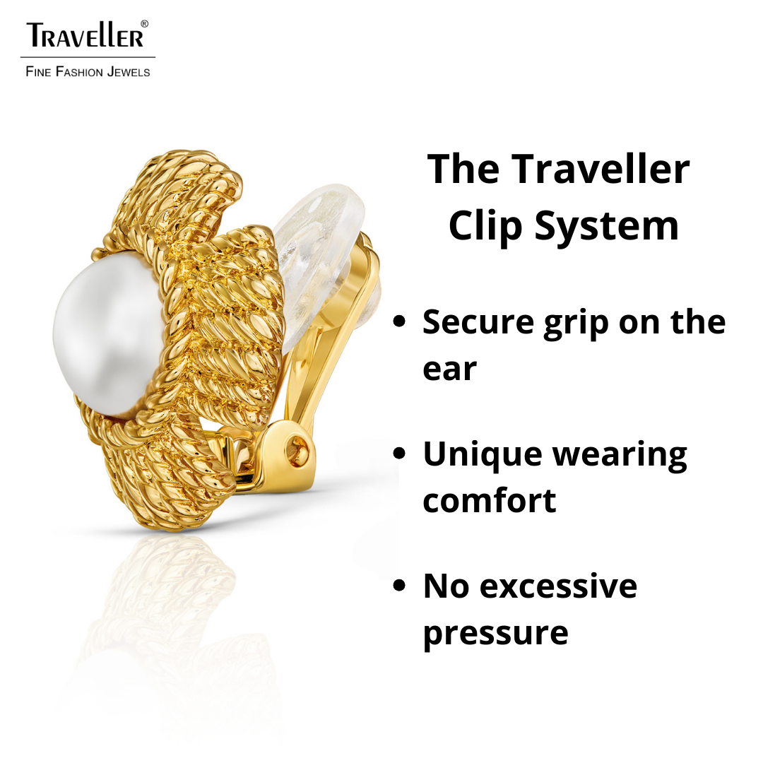 These 22 carat gold plated earrings from Traveller match any outfit. The clip-on earrings are shaped like a flower with intertwined gold leaves, in the centre a beautiful pearl (diameter 10 millimetres) from Mallorca - an island known for its high-quality imitation pearls. The ear-clips have a diameter of 23 millimetres and weigh 6.5 grams per earring. Thanks to Traveller's unique fastening system, the clip-on earrings are very comfortable, light and safe to wear.