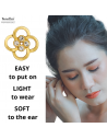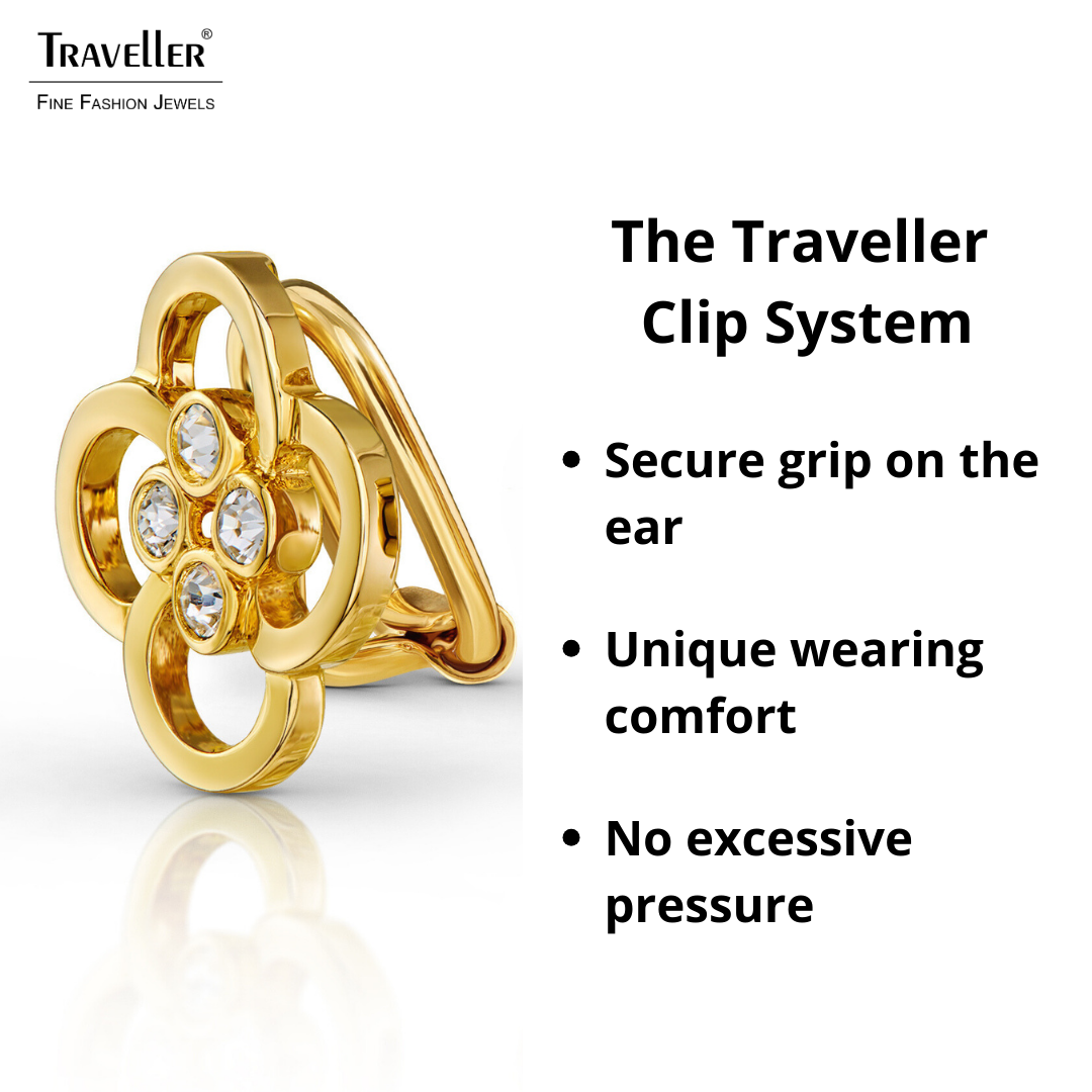 These earrings from Traveller are subtle but certainly not inconspicuous. The flower-shaped clip-on earrings consist of 4 gold coloured flower petals with 4 Preciosa crystals at the heart. The clip-on earrings are fully gold plated 22 carat gold, have a diameter of 13 millimetres and weigh just 1.75 grams per earring. Thanks to Traveller's unique fastening system, the ear-clips are very comfortable, light and safe to wear.
