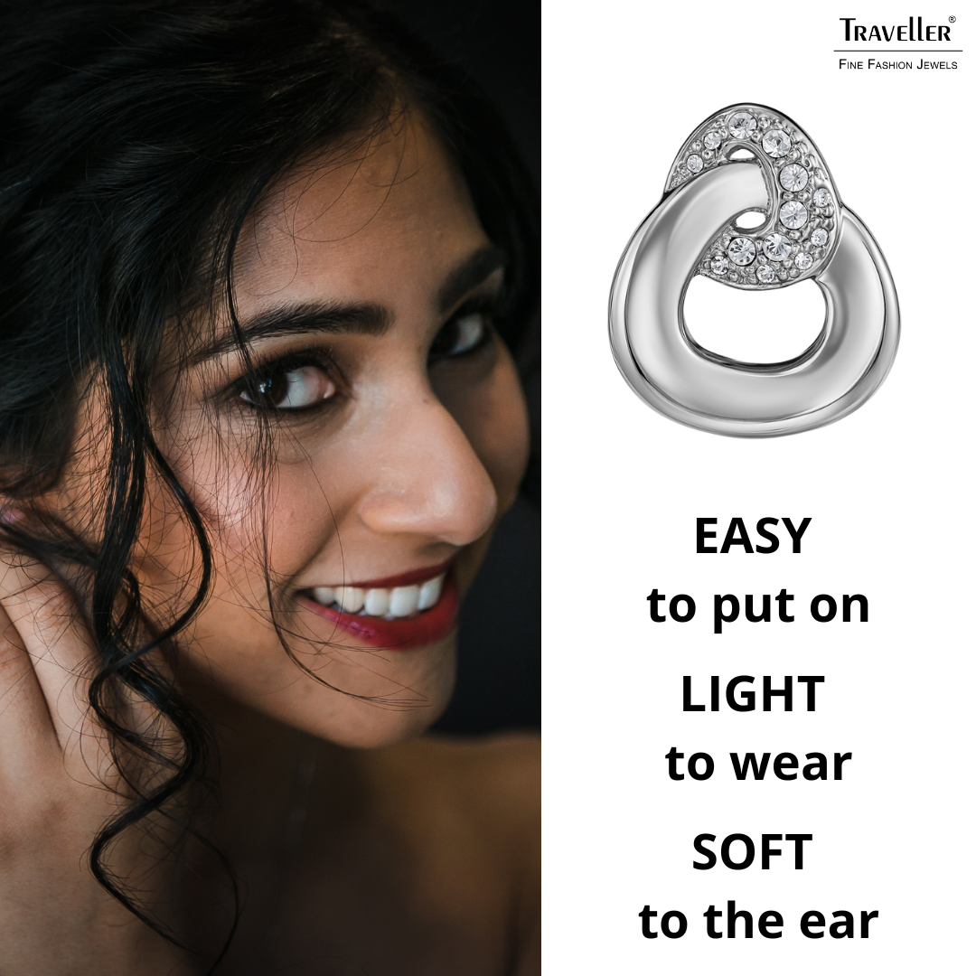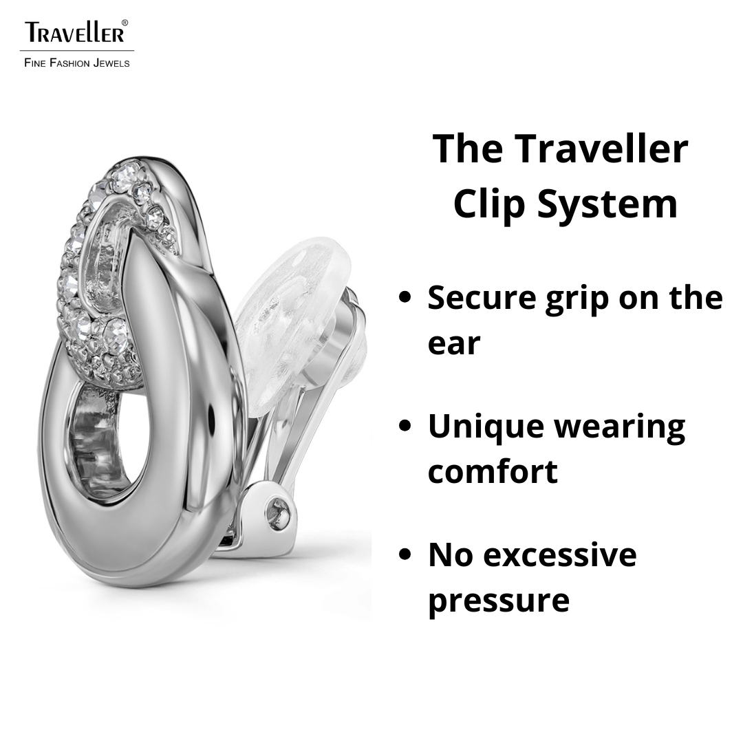 Radiate with these trendy earrings from Traveller! These platinum plated clip-on earrings consist of 2 rounded triangles. The upper one is studded with Preciosa crystals, inside this triangle hangs a larger silver coloured shiny triangle. The clip-on earrings measure 20 by 17 millimetres and weigh 3.75 grams each. Thanks to Traveller's unique fastening system, these clip-on earrings are very comfortable, light and safe to wear.