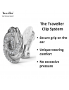 These clip-on earrings from Traveller are elegant and stylish. The silver coloured clip-on earrings are fully platinum plated and shaped like a two-stranded knot. The two strands are gracefully twisted together and consist of one strand encrusted with Preciosa crystals and the second is shiny and silver coloured. The clip-on earrings are 17 millimetres in diameter and weigh 4 grams each. Thanks to Traveller's unique fastening system, these clip-on earrings are very comfortable, light and safe to wear.