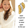 These clip-on earrings from Traveller are a simple yet striking design! The clip-on earrings consist of 3 shiny bands, the outer bands are gold coloured and the middle band is silver coloured. The gold coloured parts are gold plated with 22 carat gold and the silver coloured parts are platinum plated. Per piece, the earrings weigh 3.5 grams, they are 17 millimetres long and 10 millimetres wide. Thanks to Traveller's unique closure system, the clip-on earrings are very comfortable, light and safe to wear.