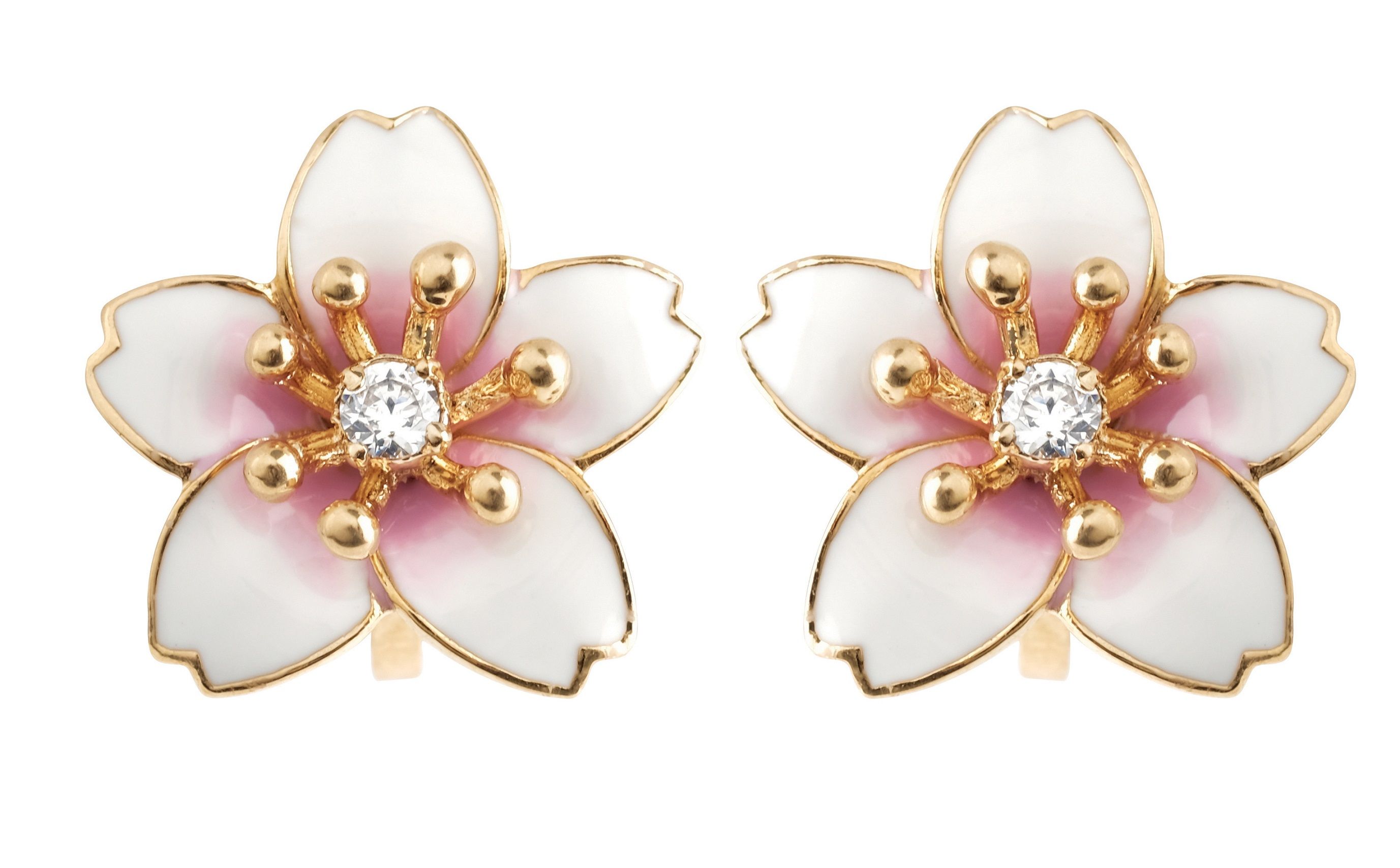 These 22 carat gold plated clip-on earrings consist of a Sakura flower with white petals which are edged in gold and have a heart of Zirconia. Beautifully detailed with gold plated stamens and pistils. They measure 1.5 by 1.5 centimetres and weigh 2 grams each.