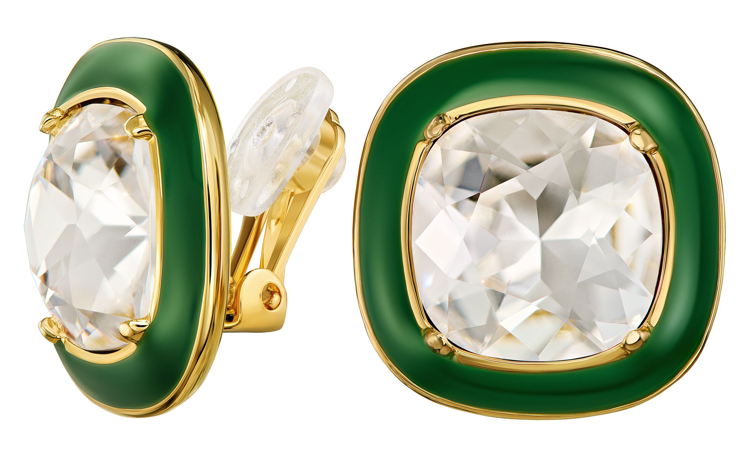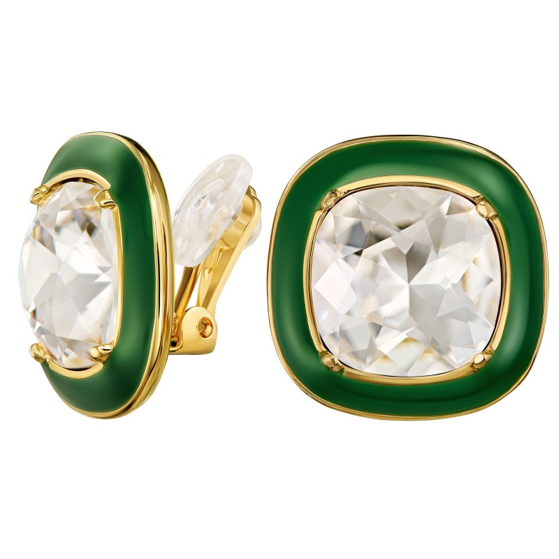 Shine like never before with these sparkling earrings from Traveller. The gold plated clip-on earrings feature a large Preciosa crystal surrounded by a shiny green enamel and gold plated border. The clips measure 18 x 18 millimetres and weigh 6 grams each. Thanks to Traveller's unique closure system, these clip-on earrings are very comfortable, light and safe to wear.