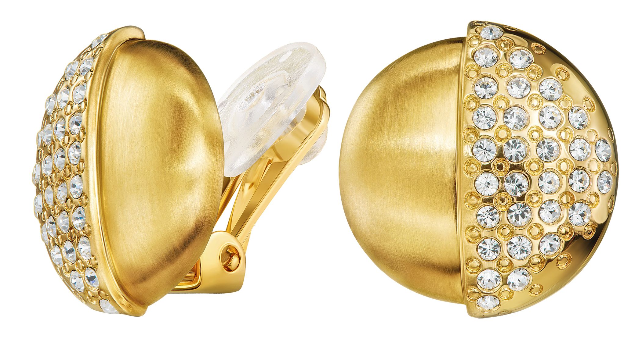 These elegant earrings from Traveller add a touch of glamour to everything! The gold plated clip-on earrings have a unique design. One half is matt-finished, the other slightly raised and studded with Preciosa crystals. The ear clips are 19 millimetres wide and 2 millimetres long and weigh 6 grams each. Thanks to Traveller's unique fastening system, these clips are very comfortable, light and safe to wear.
