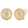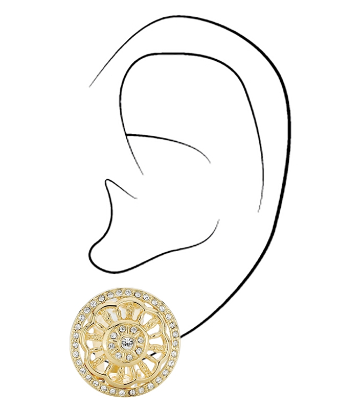These Baroque-inspired earrings showcase symmetry in its greatest beauty. The 22-carat gold plated (core material: metal) clip-on earrings consist of a circle with a flower inside - all completely symmetrical. The outer circle and the inside of the flower are studded with Preciosa crystals. The earrings have a diameter of 18 millimetres and weigh 3.5 grams each. Thanks to Traveller's unique fastening system, our clip-on earrings are very comfortable, light and safe to wear.