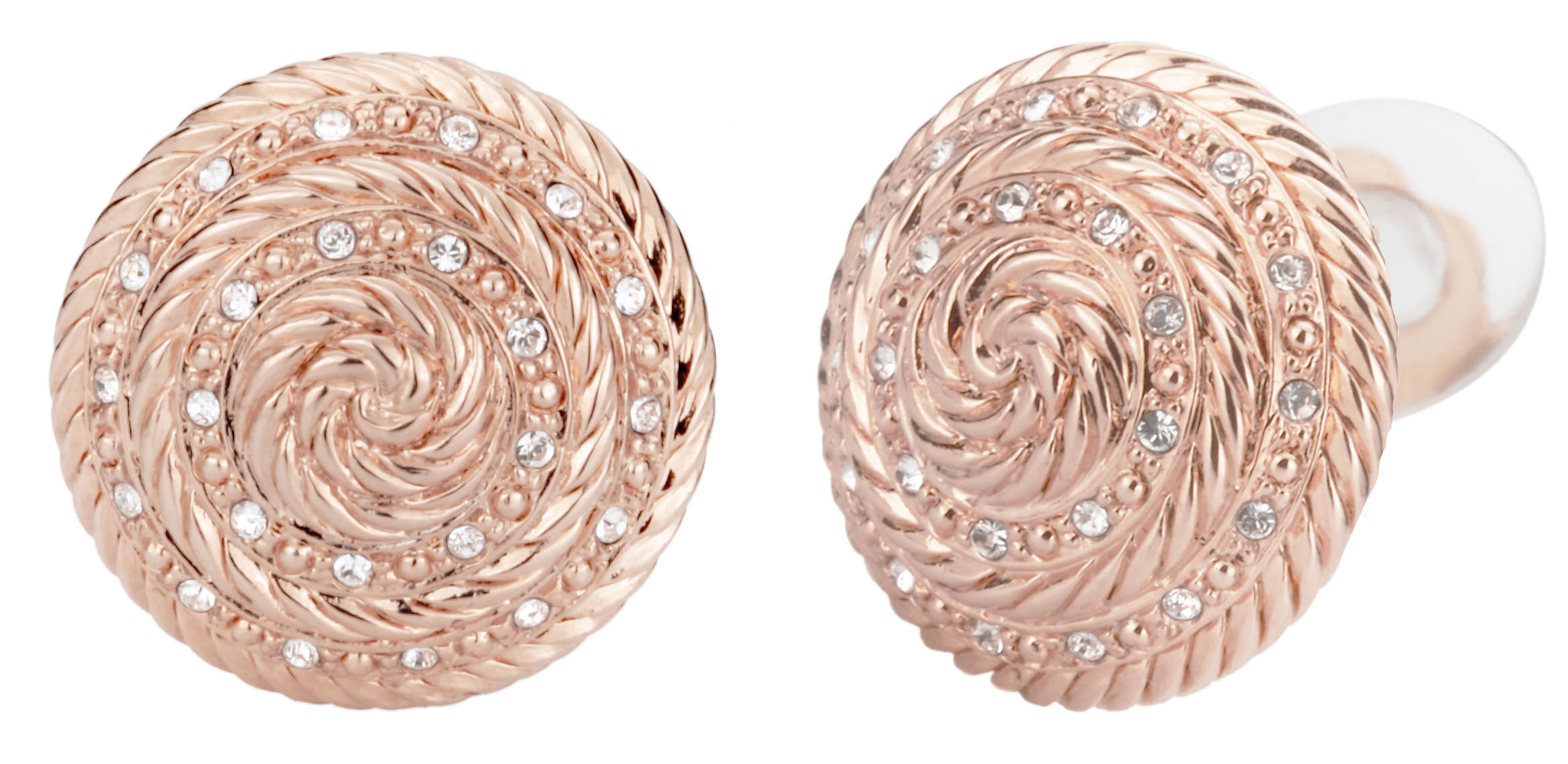 These Traveller earrings in a turban shape are a unique piece of jewellery. The rose gold plated clip-on earrings are studded with small Preciosa crystals. The earrings have a diameter of 18 millimetres and weigh 5.5 grams each. Thanks to Traveller's unique fastening system, our clip-on earrings are very comfortable, light and safe to wear.