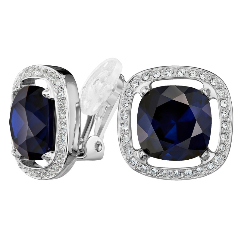 Traveller Clip-on Earrings - Silver Coloured - Crystals - Blue - Square - Platinum Plated - Ø 15mm