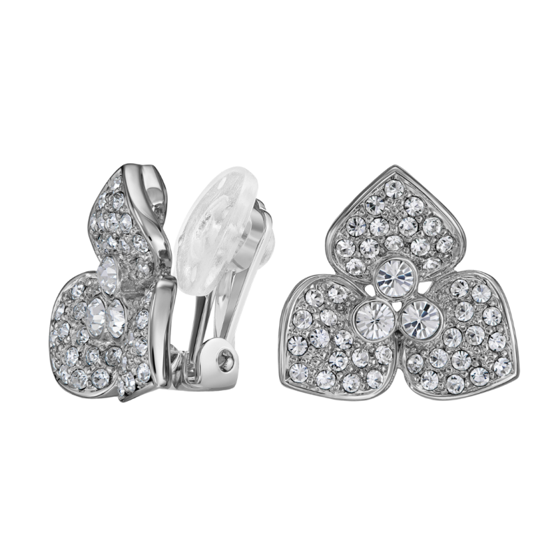 Sparkle & shine: is the best description for these stunning earrings from Traveller. The silver coloured clip-on earrings are fully platinum plated and are in the shape of a flower. The three petals of this flower are encrusted with crystals from Preciosa and the heart consists of 3 larger Preciosa crystals.