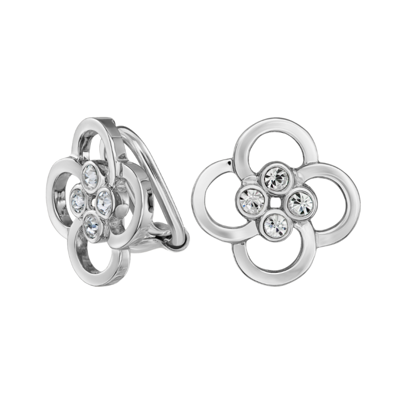 These earrings from Traveller are subtle but certainly not inconspicuous. The flower-shaped clip-on earrings consist of 4 silver coloured flower petals with 4 Preciosa crystals at the heart. The clip-on earrings are platinum plated, have a diameter of 13 millimetres and weigh just 1.75 grams per earring. Thanks to Traveller's unique fastening system, the ear-clips are very comfortable, light and safe to wear.
