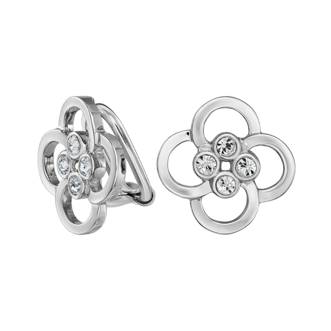 Traveller Clip-on Earrings - Silver Coloured - Crystals - Platinum Plated - Flower - 13 mm