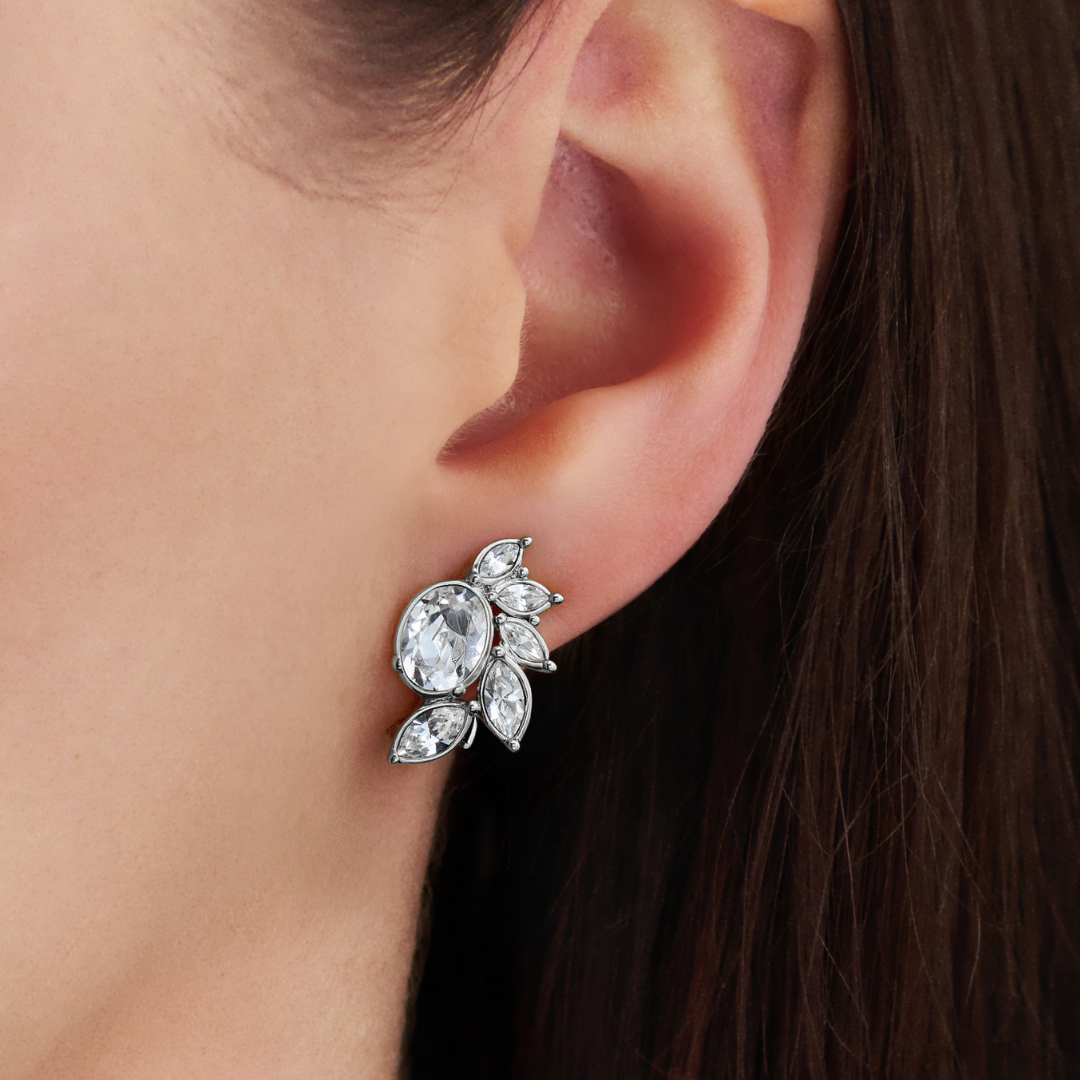 Radiate with these stunning earrings from Traveller, a beautiful design to make you feel completely happy. The silver coloured clip-on earrings are platinum and are shaped like half a flower. The heart consists of a large crystal and the four petals taper from smaller to larger underneath, the petals also consist of beautiful Preciosa crystals. The clip-on earrings measure 20 by 12 millimetres and weigh 2.8 grams each. Thanks to Traveller's unique fastening system, the clip-on earrings are very comfortable, light and safe to wear.