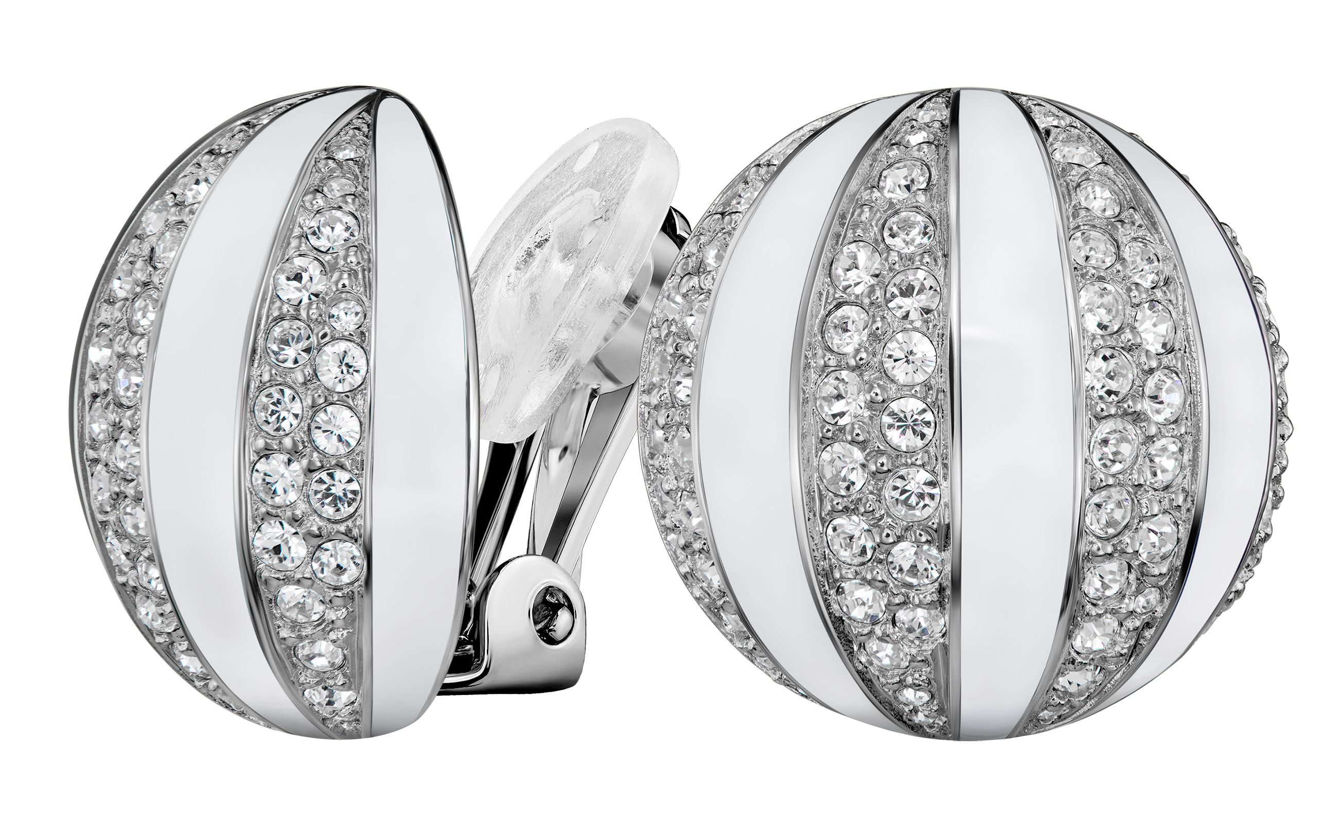 These elegant silver coloured clip-on earrings from Traveller will sparkle on your ears. The spherical platinum plated earrings feature alternating bands of platinum studded with Preciosa crystals and shiny white enamel. The clips measure 2 x 2 millimetres and weigh 8 grams each. Thanks to Traveller's unique fastening system, these clip-on earrings are very light, comfortable and safe to wear. Thanks to Traveller's unique closure system, these clips are very light, comfortable and safe to wear.